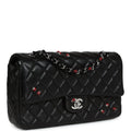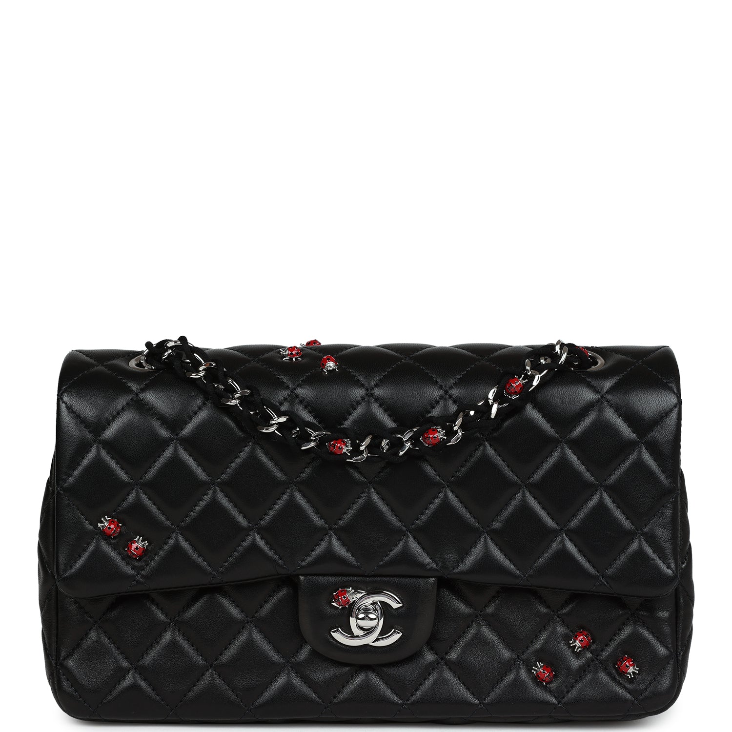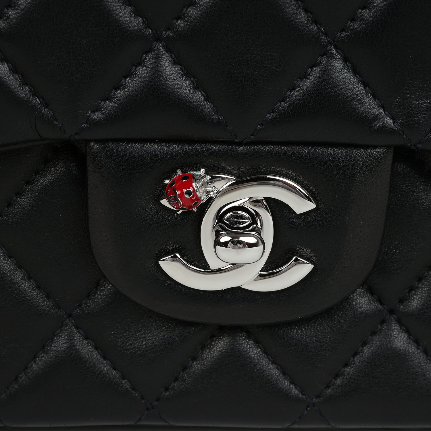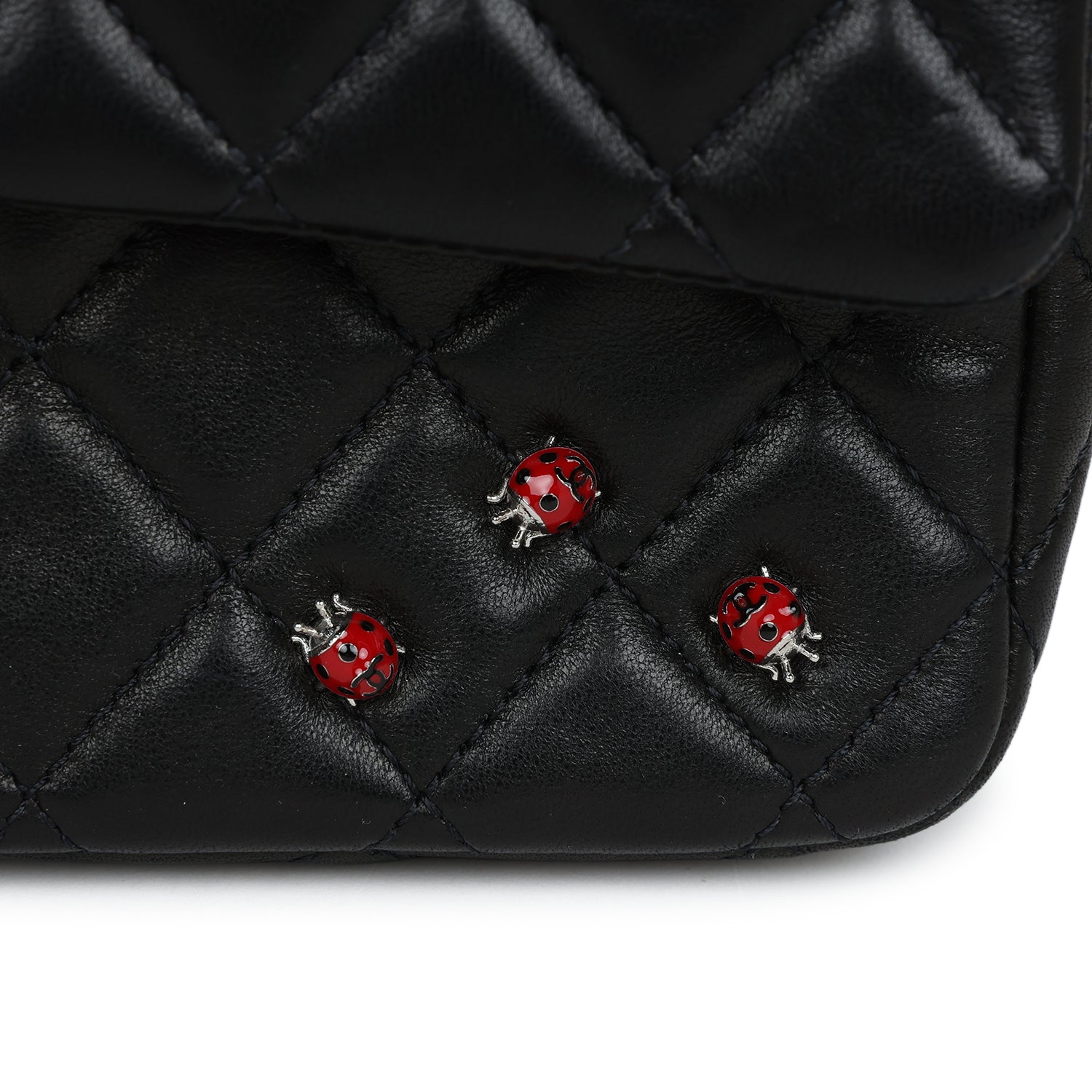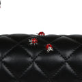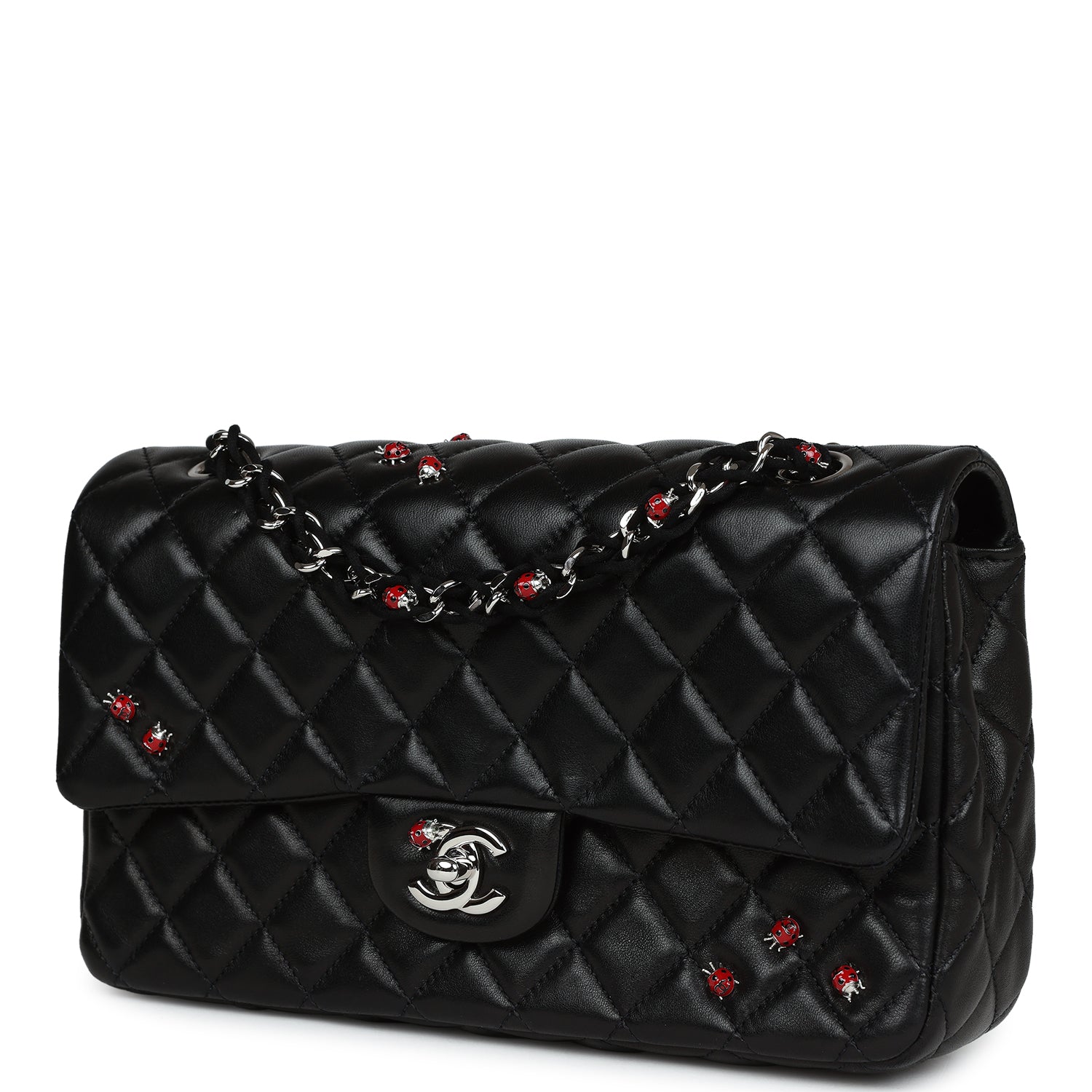 This medium classic single flap bag is in Black quilted lambskin leather with silvertone hardware and features Red and Silver lady bugs on the body of the bag, a front flap with signature CC turnlock closure, and a half moon back pocket.