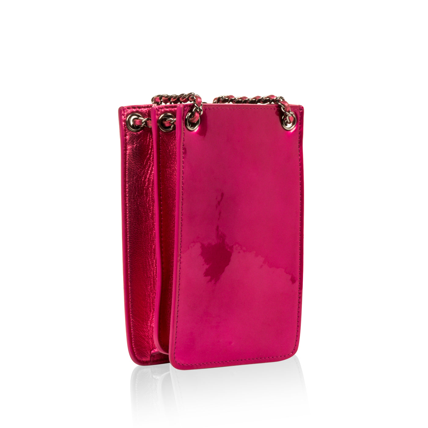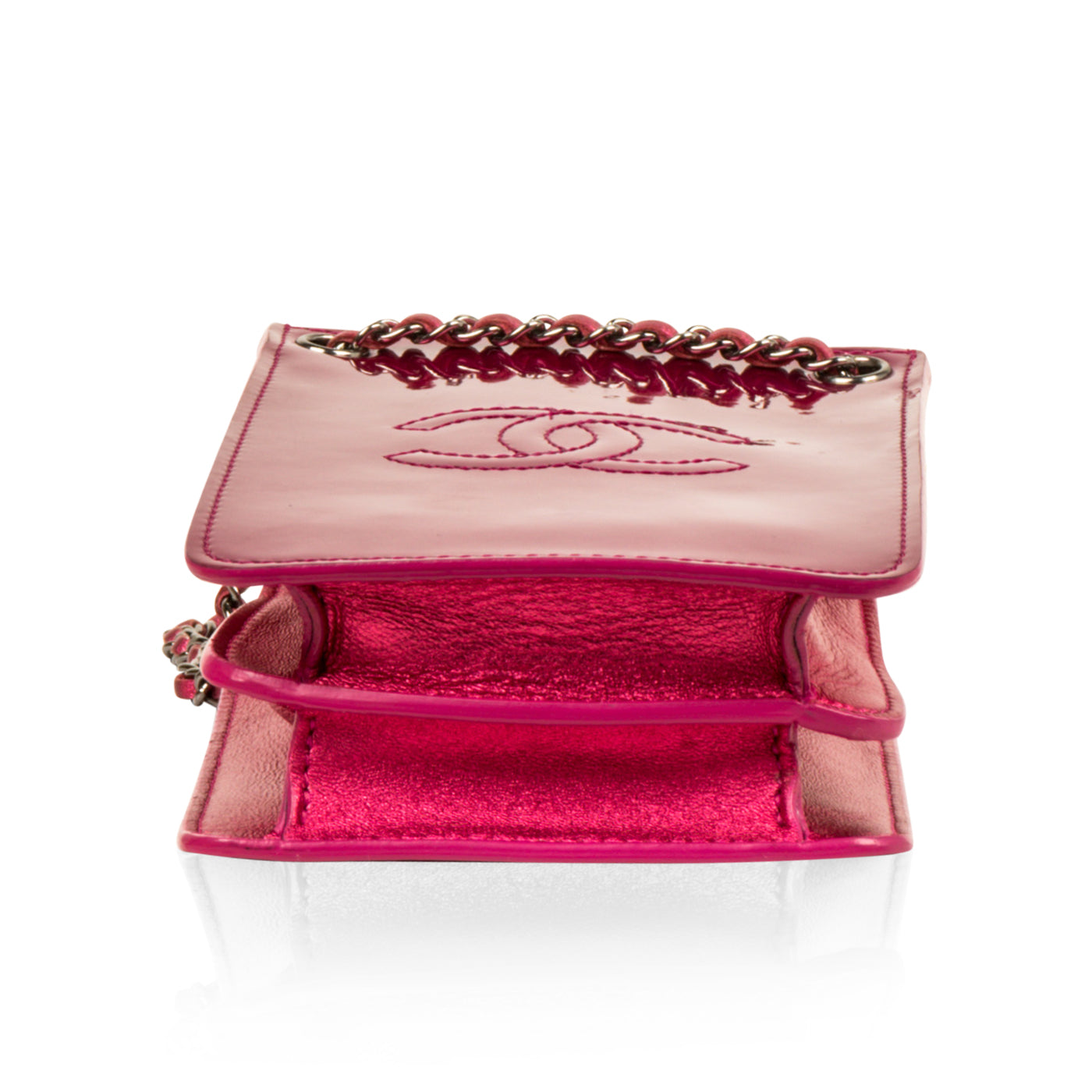 The Chanel Metallic Pink Patent Phone Case Crossbody Bag is the perfect accessory to complete any outfit. The hot pink patent leather bag features a stitched interlocking CC logo with the classic leather interwoven chain strap which can also be worn crossbody or doubled up and worn on your shoulder. This bag is an easy, efficient way to carry your phone and be completely handsfree. This stunning little gem is a well-worthy addition to your handbag collection.