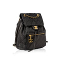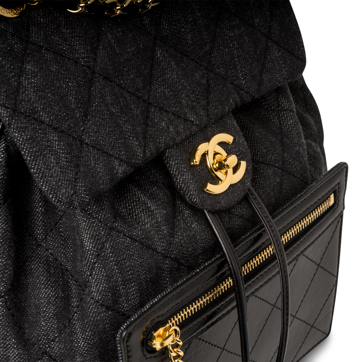 Carefully crafted from grey denim with black leather features, Chanel presents the stunning Cosmopolite backpack. A true must have for any Chanel lover, this gorgeous piece is the perfect balance between fashion and function. Spacious enough to hold all your every day necessities comfortably inside, the Cosmopolite backpack also features a quilted black leather front pocket for additional storage. With a front flap featuring a drawstring closure, romantic gold tone hardware, signature interwoven chain / leather detail and black leather straps, this backpack is luxurious, practical and classic. A well worthy addition to any luxury handbag collection, the timeless backpack is a piece you won't regret investing in.