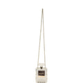This Minaudiere clutch is in transparent plexiglass in the shape of a Chanel No. 5 perfume bottle with light gold hardware, the Chanel logo at the center, a frame push down closure and a long shoulder/crossbody strap that can be tucked away.