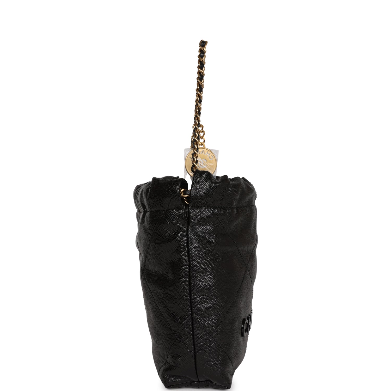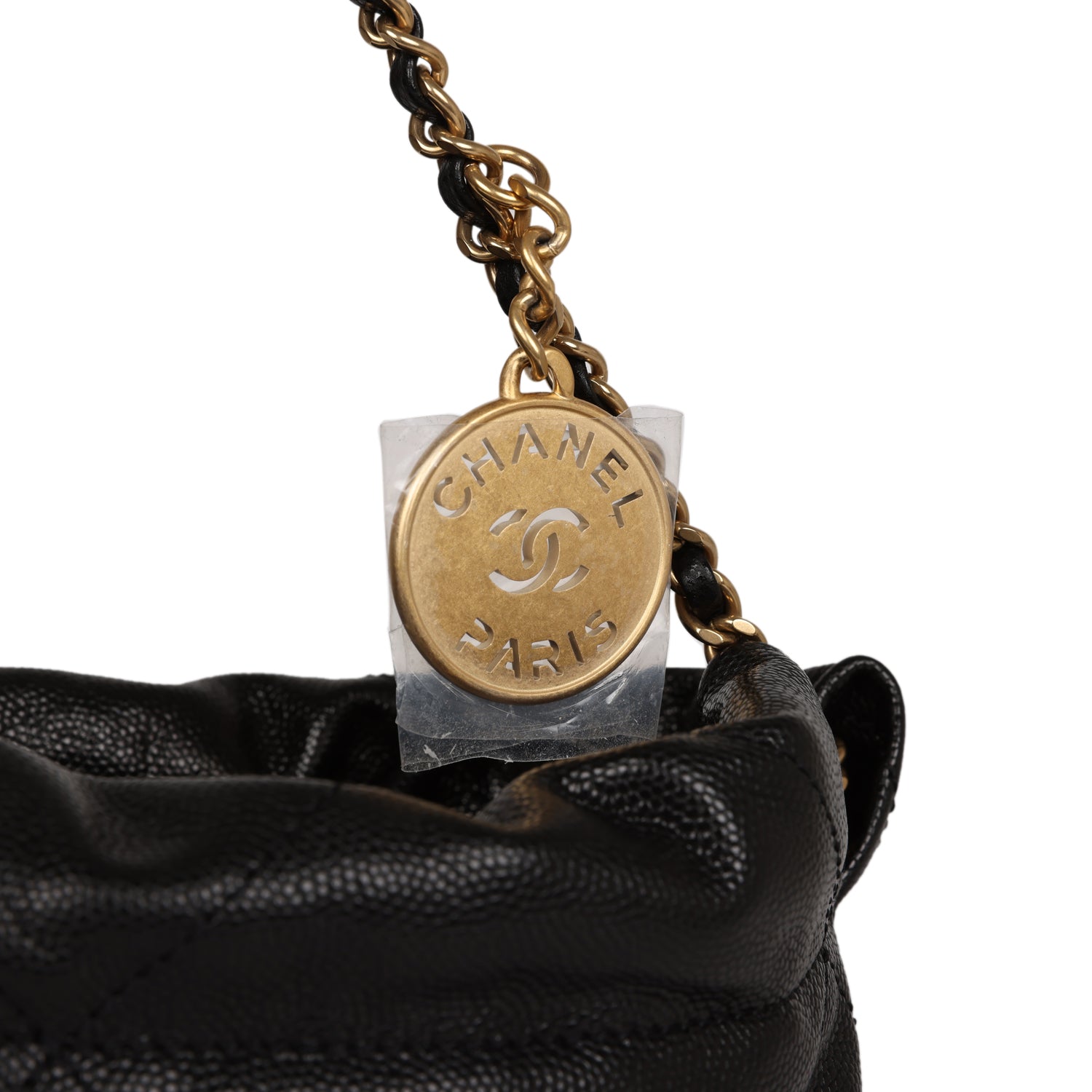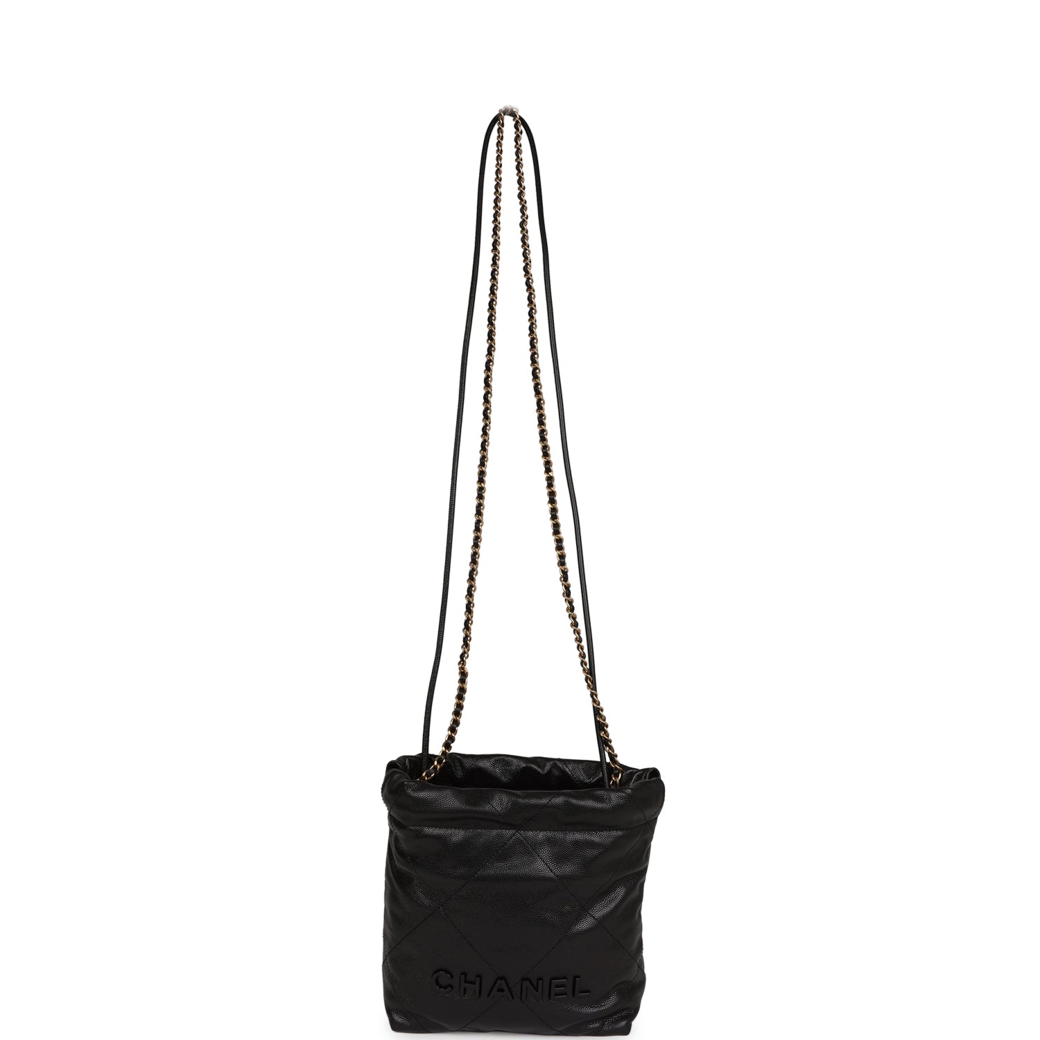This Mini 22 Hobo Bag is in black caviar with gold tone hardware, CHANEL on the front in black tone metal, a short gold tone and leather interwoven chain, a long one, and a long leather cord strap.