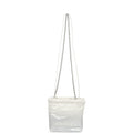 This Chanel mini 22 Hobo Bag is in white and silver ombre metallic calfskin with silver tone metal hardware and signature diamond quilting, a white lacquered metal "Chanel" logo on front of bag, Chanel Paris metal hang tag, interwoven chain link with silver tone metal and white leather, one long leather cord, one long chain link shoulder strap.