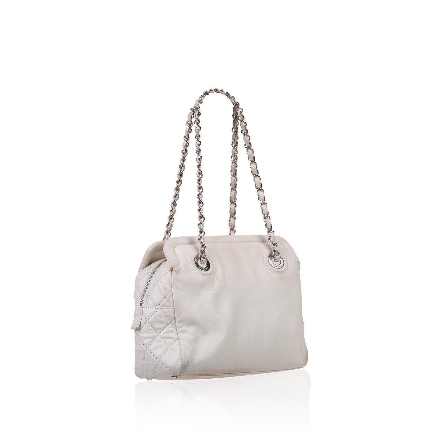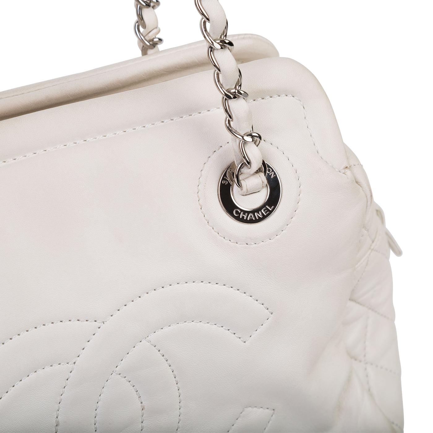 Carefully crafted from smooth, white leather with quilted side features and silver tone hardware - this elegant Chanel is the ideal must-have for your every day, go-to bag. With the CC logo prominently stitching at the front of the bag and stylish silhouette, the Bowler is the perfect balance of fashion and function. Fit all your day-to-day essentials inside the large, spacious compartment featuring a singular slip pocket, mobile phone pocket, and an additional zip pocket. Given the stunning white hue, this piece is the perfect accessory to compliment any casual outfit, especially in the summertime. Designed for the modern woman with a love for luxury and timeless elegance.