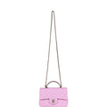 This Mini flap bag with top handle is in pink lambskin with light gold tone hardware and has a front flap with signature CC turnlock closure, rear half moon pocket, top handle and single interwoven pink and green leather and light gold tone chain link shoulder/crossbody strap.