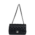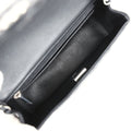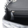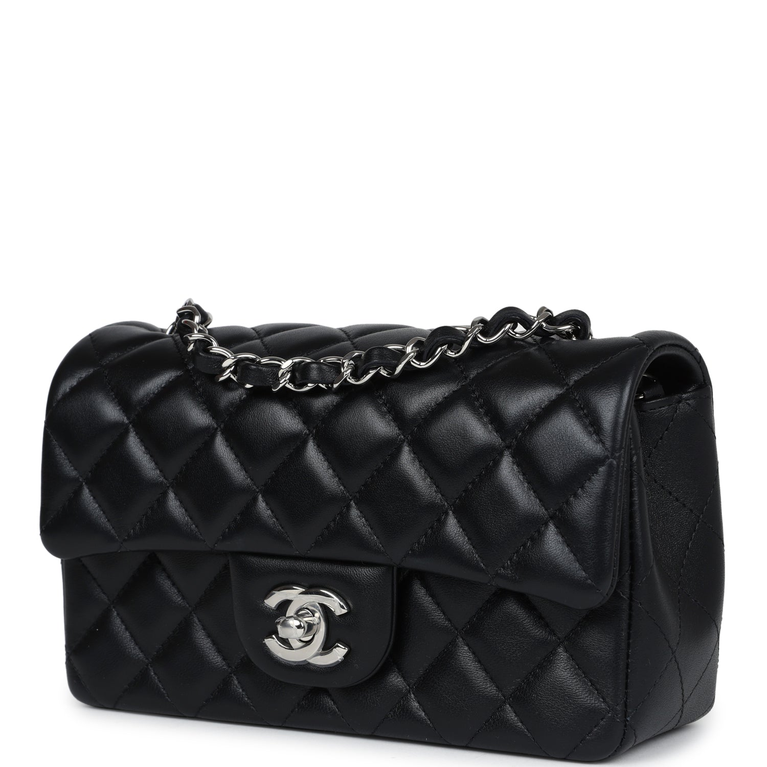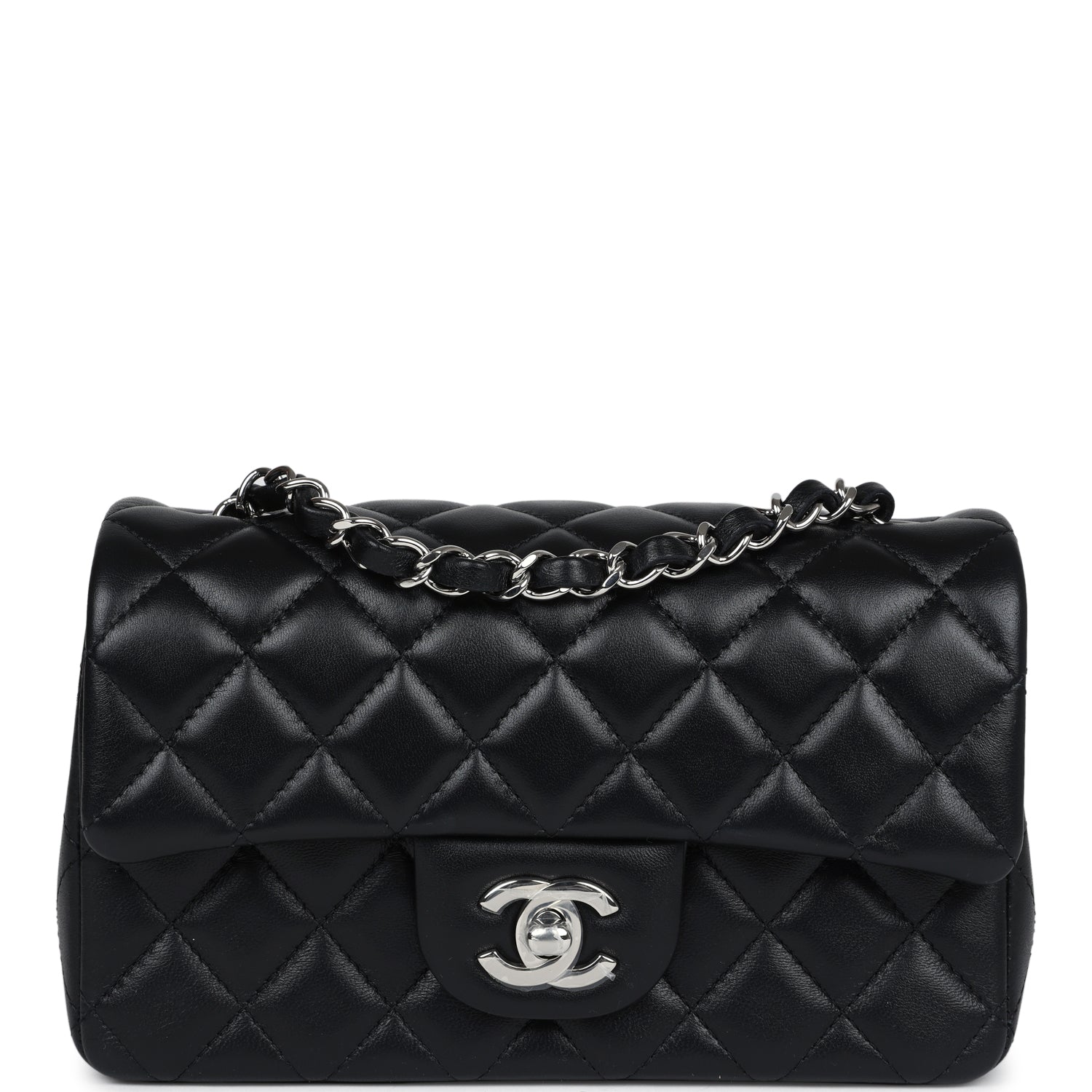 This mini rectangular flap bag is in black lambskin with silver hardware and has a front flap with signature CC turnlock closure, rear half moon pocket and single interwoven black leather and silver tone chain link shoulder/crossbody strap.