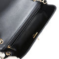 This Mini Rectangular Flap Bag is of black lambskin with light gold tone hardware, a front flap with CC turnlock closure, half moon back pocket and an interwoven light gold tone chain link and black leather crossbody strap.