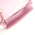This Mini Rectangular Flap Bag is in pink tweed and sequin fabric with light gold tone hardware and has a front flap with signature CC turnlock closure and an interwoven light gold tone chain link and Pink leather shoulder/crossbody strap.