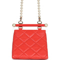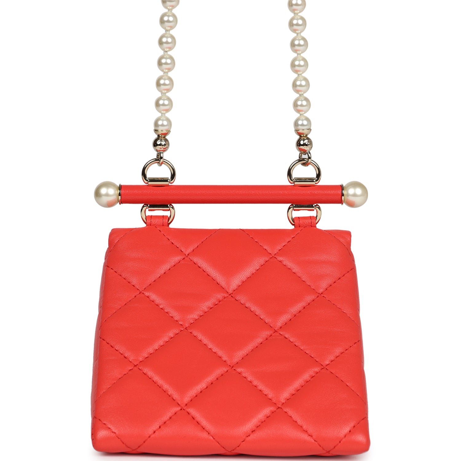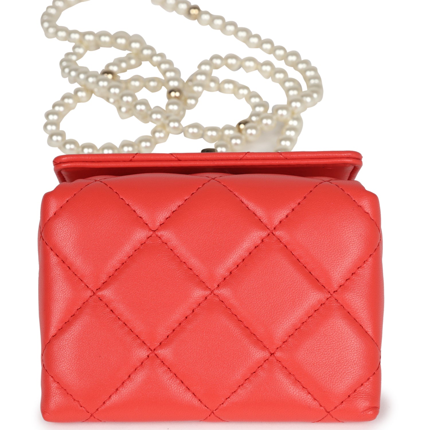 This Chanel Mini Clutch with pearl chain is in red lambskin leather with light gold hardware and faux pearls, featuring a geometric shaped mini clutch, signature quilt, a front CC turnlock closure, and a faux pearl and light gold tone shoulder strap attached to a bar.
