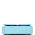 This Small Flap Bag in Ombre Blue Grained Calfskin leather with lacquared metal hardware and features gradient ombre leather, tonal stitching, push lock and snap lacquered CC closure, long slit pocket on exterior of bag and mixed leather and lacquered metal shoulder strap.