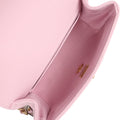 The interior is lined in light pink leather and grosgrain fabric, featuring one slit pocket on the rear wall.