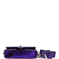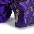 The interior is lined in Purple Metallic calfskin leather, one slip pocket with Chanel logo and one zippered pocket.
