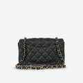 Crafted from luxurious soft lambskin, this Mini Flap features the iconic CC turn-lock closure and a leather-interwoven chain strap, allowing it to be styled crossbody or on the shoulder. Its elegant black finish paired with champagne gold hardware gives it a classic yet contemporary look - perfect for both day and evening wear.