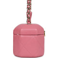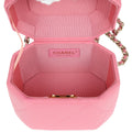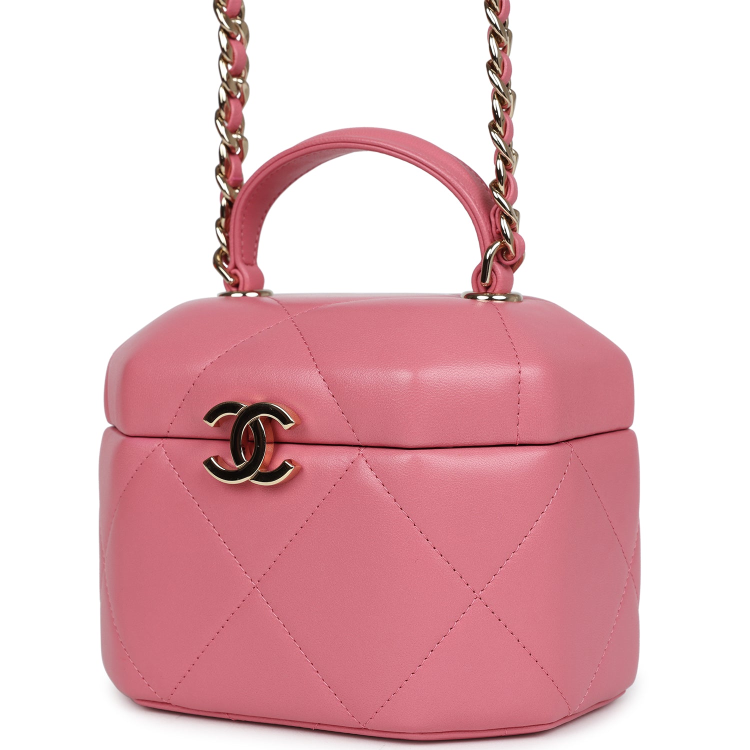 As featured in Greta Gerwig's Barbie, this Mini Vanity Case is in Dark Pink Quilted Lambskin leather with Gold Hardware, features a hexagon case design, a top handle, a gold CC flip lock closure, and a gold interwoven with pink leather shoulder/crossbody strap.