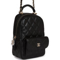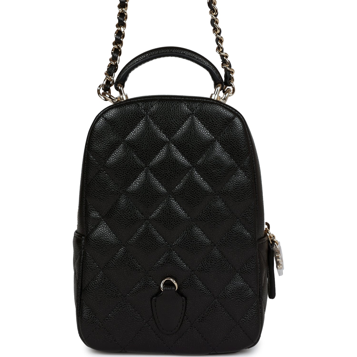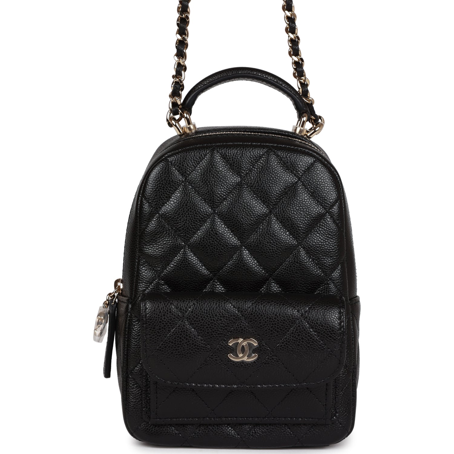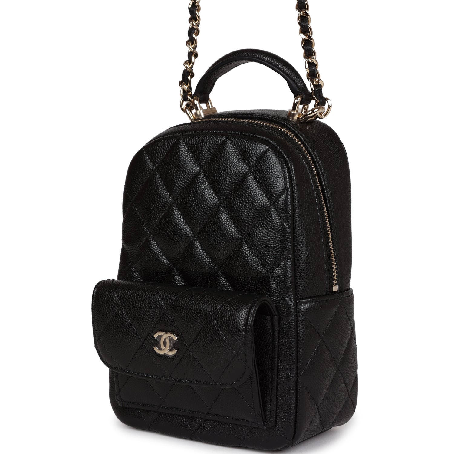 This Mini Phone Holder Backpack with Chain is in Black Caviar leather with Light Gold Hardware, features a backpack style bag, small front snap coin pocket with CC logo, leather top handle, zip around closure with leather pull and CC logo charm, convertible light gold tone chain interwoven with black leather crossbody/shoulder strap.