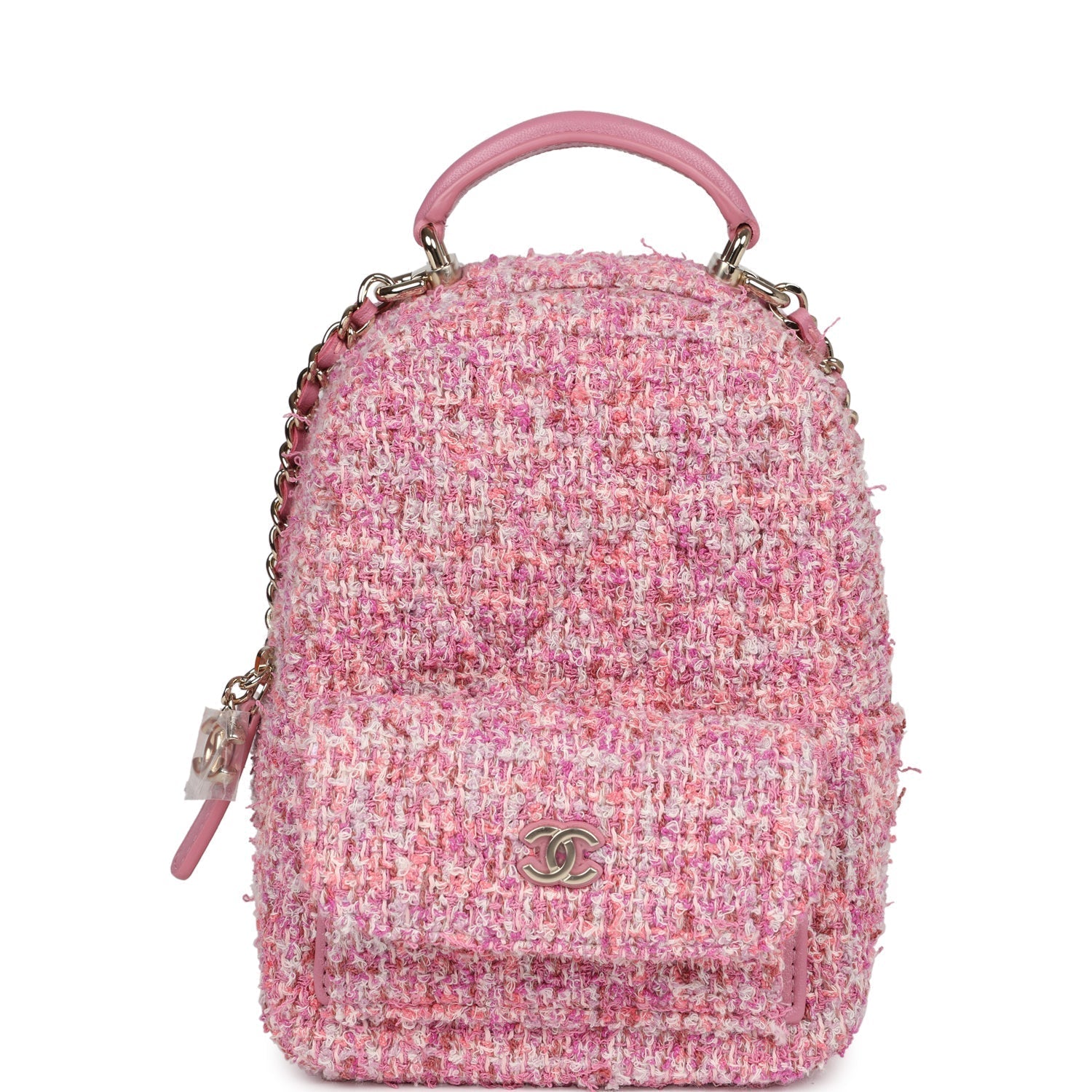 This Chanel mini phone holder backpack with chain is in pink multicolored tweed with light gold hardware, features a backpack style bag, small front snap coin pocket with CC logo, pink leather top handle, zip around closure with leather pull and CC logo charm, convertible light gold tone chain interwoven with light pink leather crossbody/shoulder strap.
