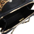 The interior is lined in black leather and has two main open compartments and two slip pockets.