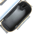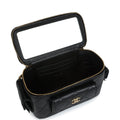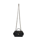 This Mini Vanity Top Handle Case Chain Clutch is in Black caviar leather with gold hardware and features a box-like design, zipper closure, CC on front of bag, Gold and Black top handle, three exterior pockets, an interwoven brushed gold and black leather shoulder/crossbody strap, CC stitched on bottom of bag.