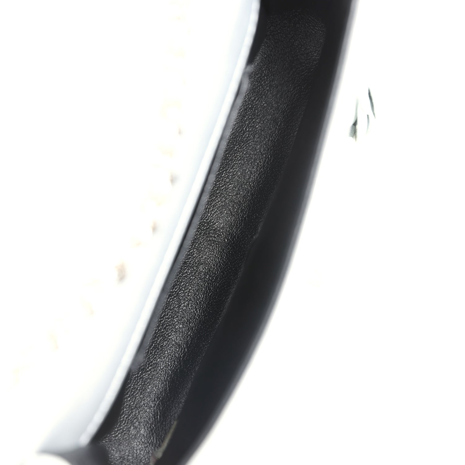The interior is lined in black leather and has one slip pocket on rear wall.