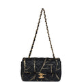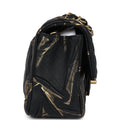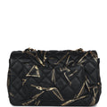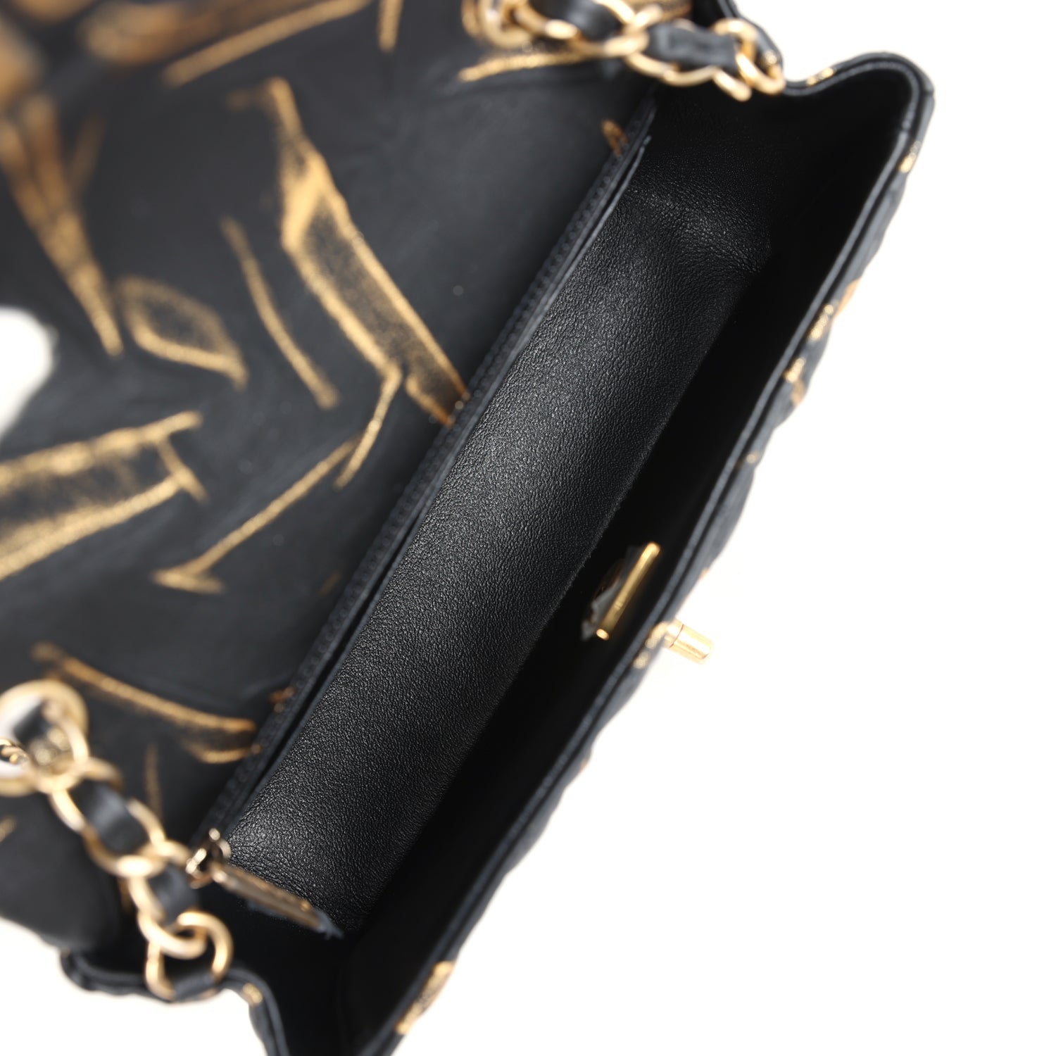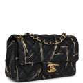 This mini rectangular flap bag is in black and gold crumpled aged calfskin leather with antique gold tone hardware and has signature diamond quilted with printed gold accents, a front flap with signature CC turnlock closure, rear half moon pocket and single interwoven black leather and antique gold tone chain link shoulder/crossbody strap.
