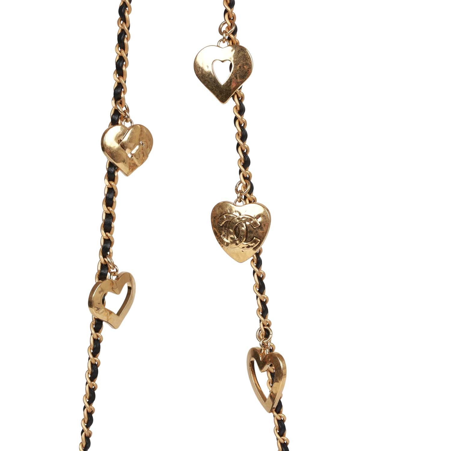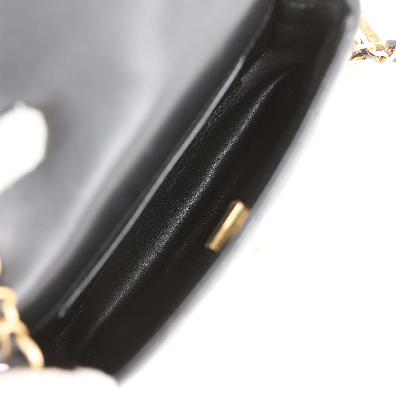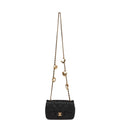 This mini rectangular flap bag is in Black lambskin leather with light gold tone hardware and has a front flap with signature CC turnlock closure, rear half moon pocket, single interwoven black leather and light gold tone chain link shoulder/crossbody strap with dangling gold hearts.