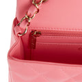 This Mini Rectangular flap bag is of coral lambskin leather with light gold tone hardware and has a front flap with signature CC turnlock closure, rear half moon pocket, single interwoven coral leather and light gold tone chain link shoulder/crossbody strap.