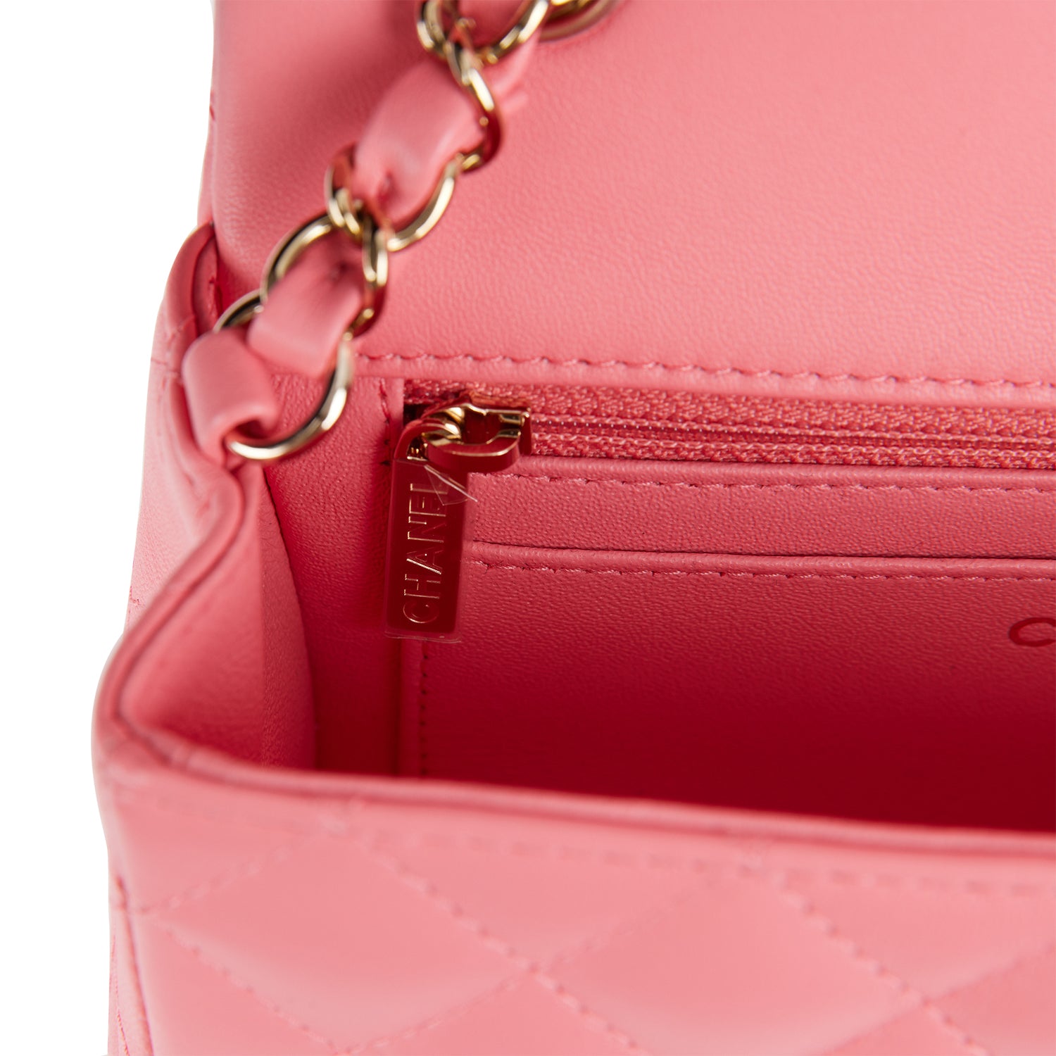 The interior is lined in coral leather and features a zipper pocket with Chanel pull and an open pocket below.
