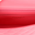 The interior is lined in hot pink leather and features a zipper pocket with Chanel pull and an open pocket below.