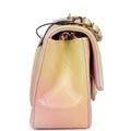 This Chanel mini classic rectangular flap bag is of ombre iridescent pink, orange and yellow lambskin leather with light gold tone hardware and has a front flap with signature CC turnlock closure, rear half moon pocket, single interwoven ombre leather and light gold chain link shoulder/crossbody strap.
