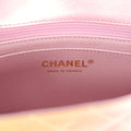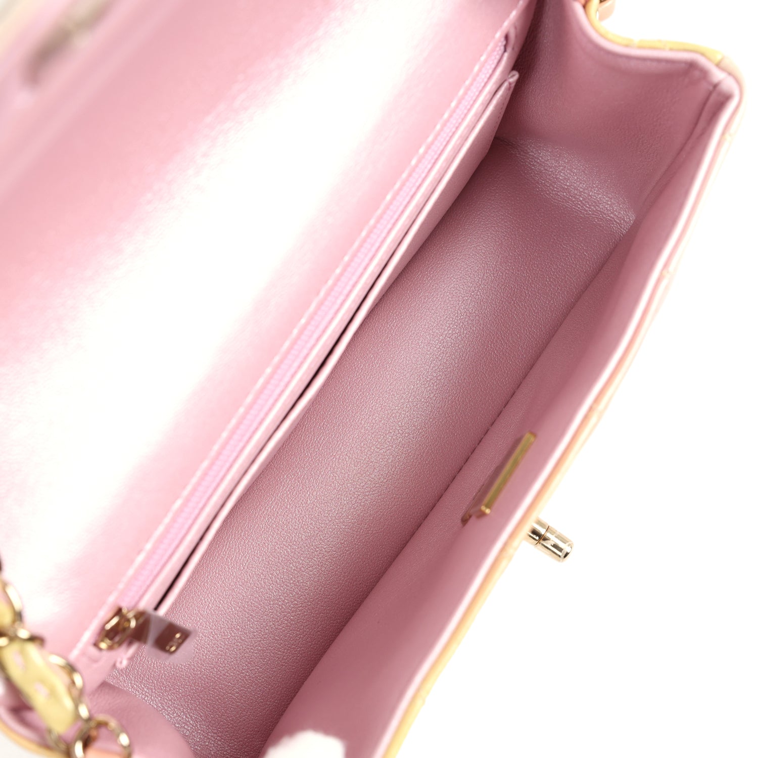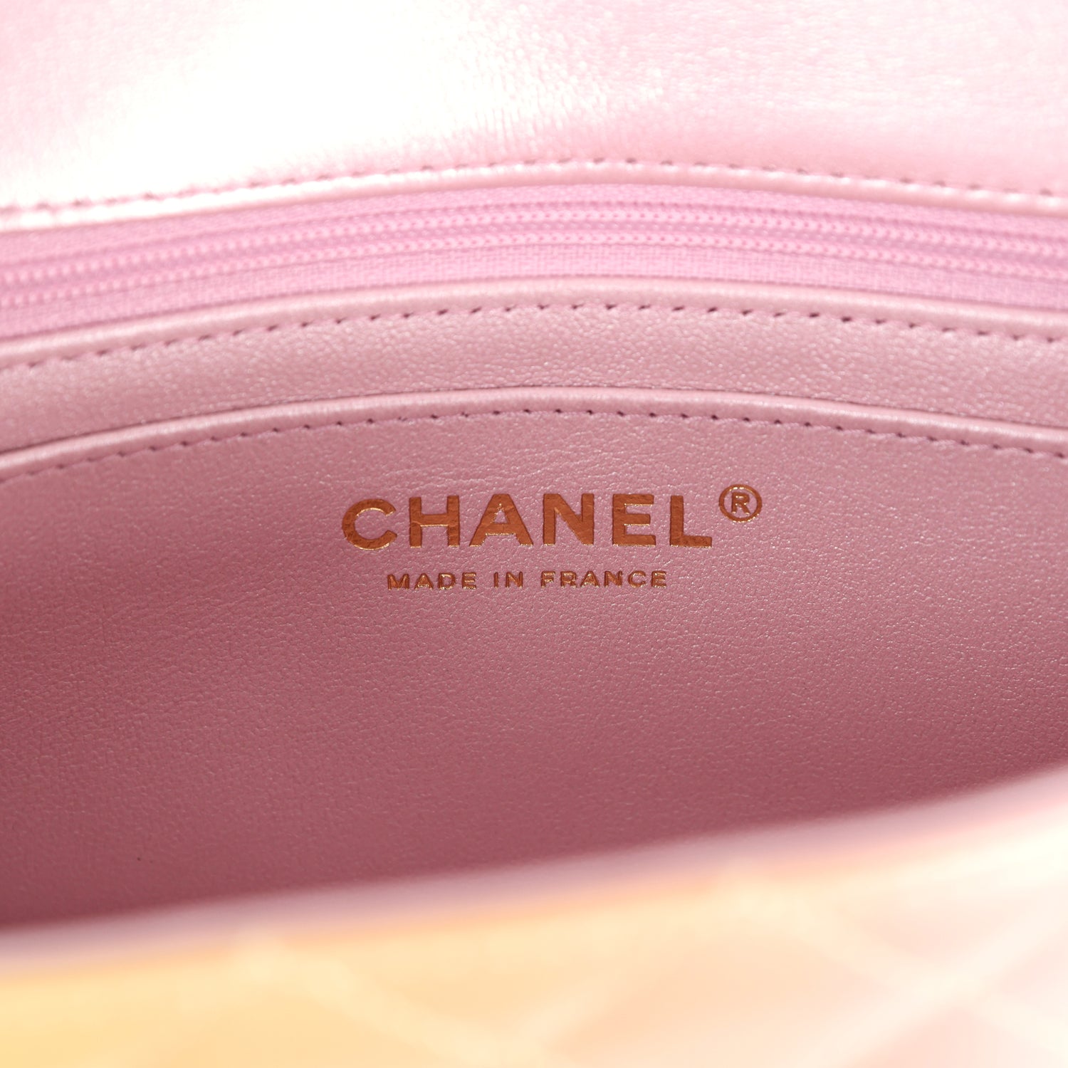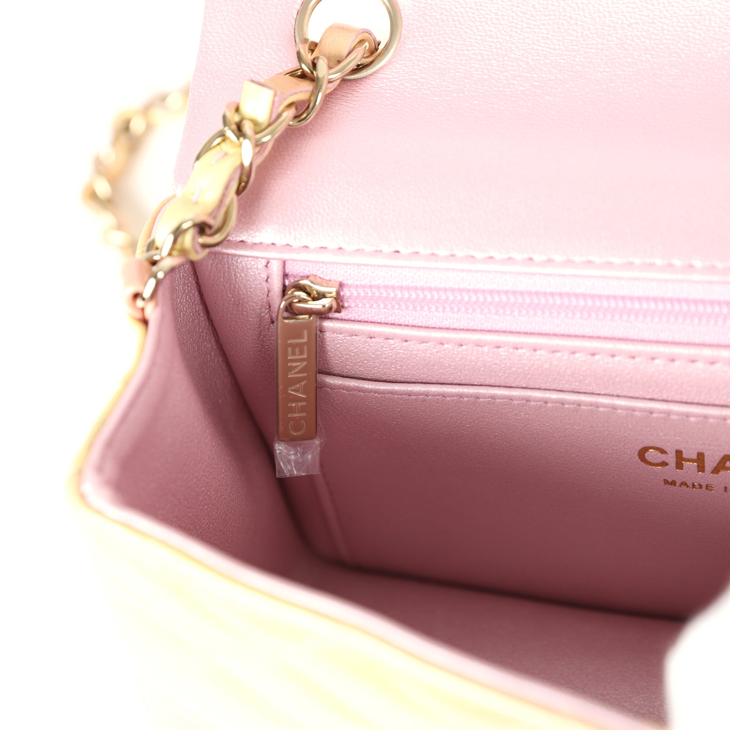 The interior is lined in iridescent pink leather and features a zipper pocket with Chanel pull and an open pocket below.