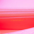 This Mini Rectangular flap bag is of pink lambskin leather with light gold tone hardware and has a front flap with signature CC turnlock closure, rear half moon pocket, single interwoven pink leather and light gold tone chain link shoulder/crossbody strap.