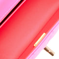 The interior is lined in pink leather and features a zipper pocket with Chanel pull and an open pocket below.