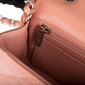 This Mini Rectangular flap bag is of rose lambskin leather with silver tone hardware and has a front flap with signature CC turnlock closure, rear half moon pocket, single interwoven rose leather and silver tone chain link shoulder/crossbody strap.