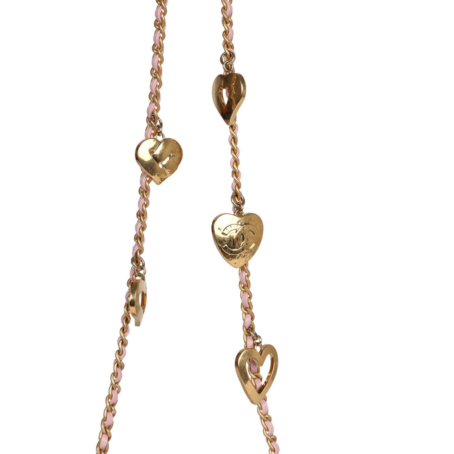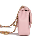 This Mini Rectangular flap bag is of pink lambskin leather with antique gold tone hardware and has a front flap with signature CC turnlock closure, rear half moon pocket, single interwoven rose leather and antique gold tone chain link shoulder/crossbody strap with heart charms.