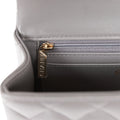 The interior is lined in dark grey leather and features a zipper pocket with Chanel pull and an open pocket below.
