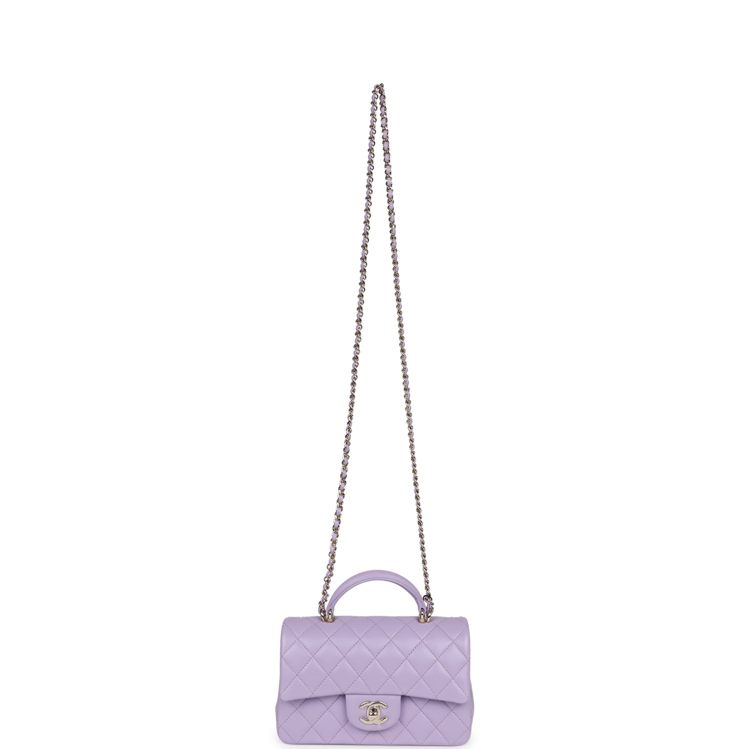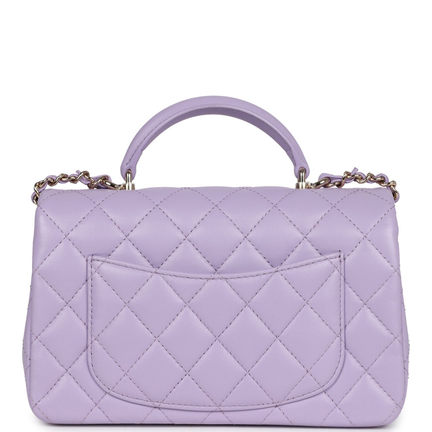 This mini Chanel rectangular flap bag with top handle is in lilac lambskin with light gold tone hardware has a front flap with signature CC turnlock closure, rear half moon pocket, top handle and single interwoven lilac leather and light gold tone chain link shoulder/crossbody strap.