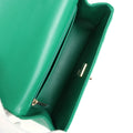 This Mini Rectangular flap bag is in green lambskin with light gold tone hardware and has a front flap with signature CC turnlock closure, rear half moon pocket, top handle and single interwoven green leather and light gold tone chain link shoulder/crossbody strap.