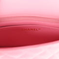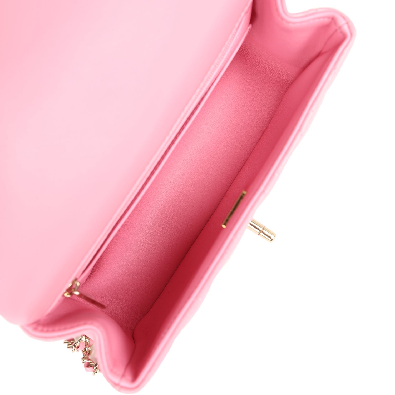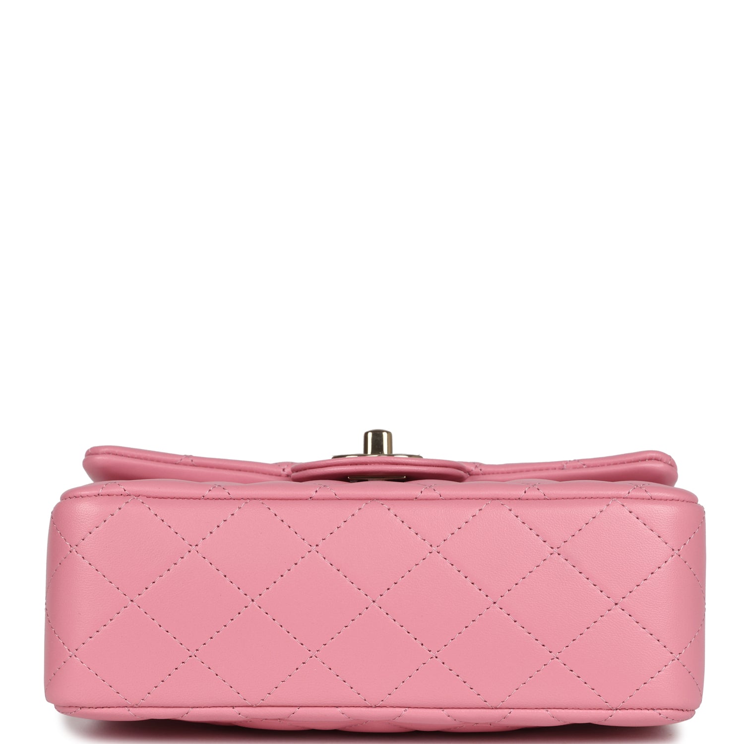 This Mini Rectangular flap bag is in pink lambskin with light gold tone hardware and has a front flap with signature CC turnlock closure, rear half moon pocket, pink top handle and single interwoven pink leather and light gold tone chain link shoulder/crossbody strap.
