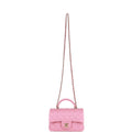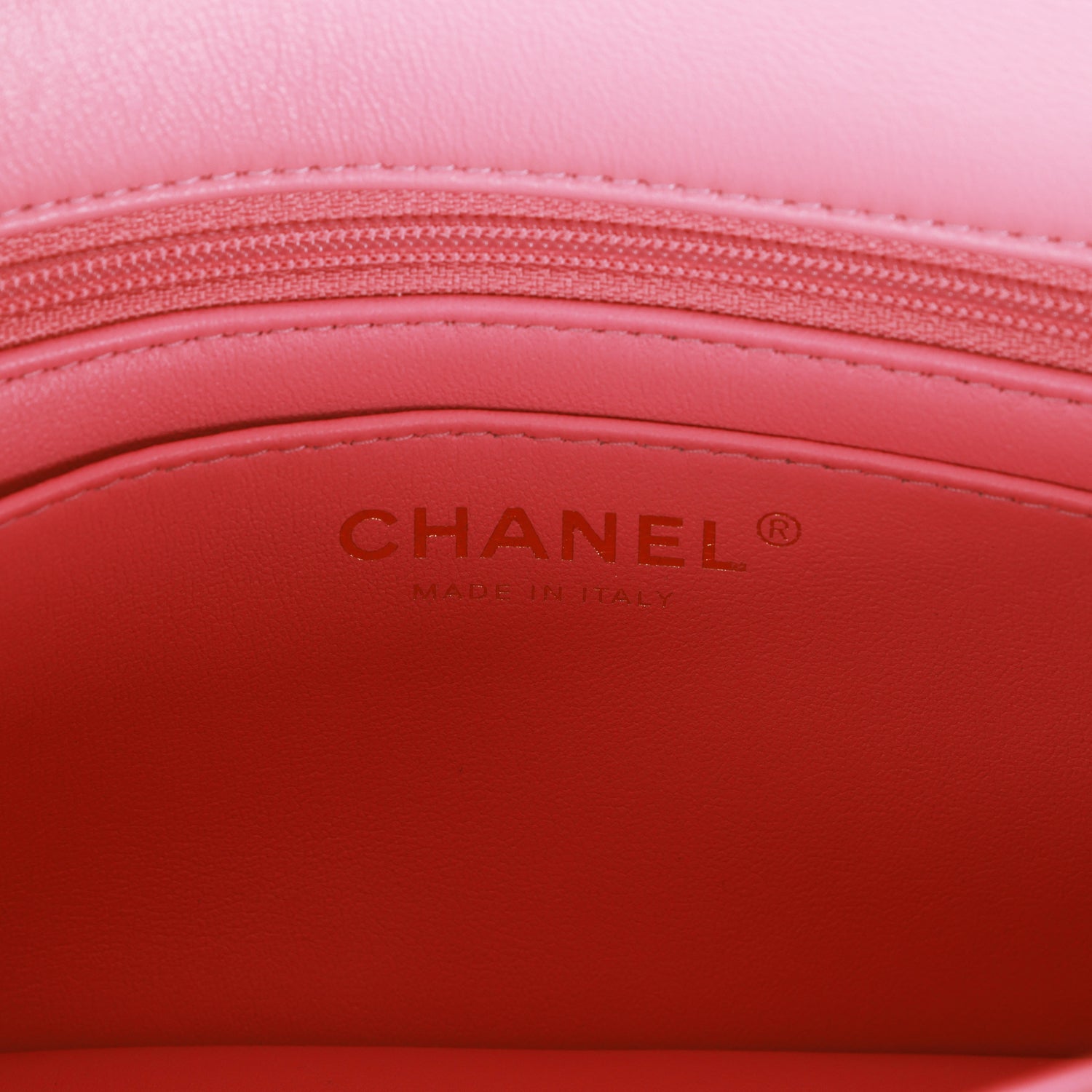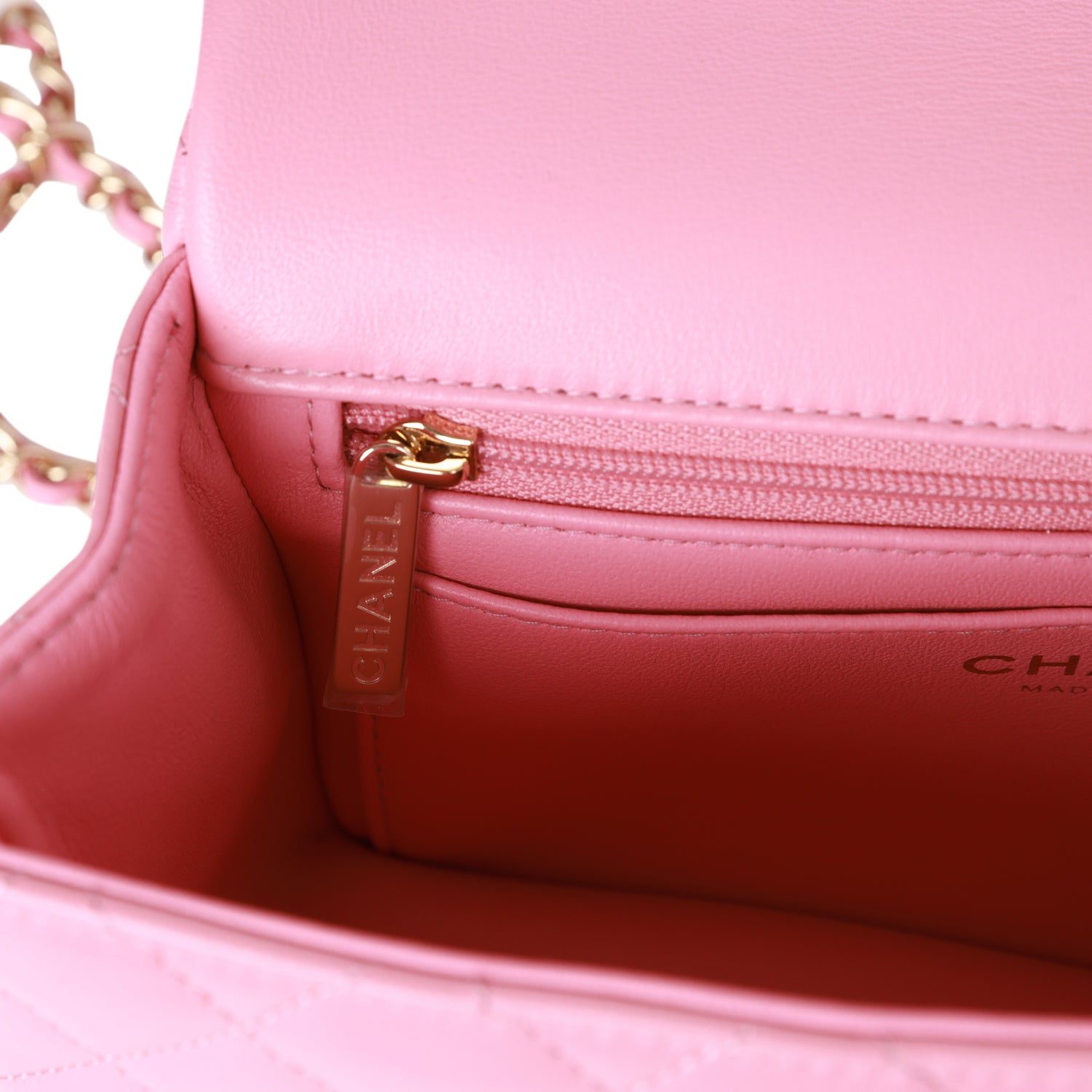 This mini rectangular flap bag with top handle is in Pink quilted lambskin leather with light gold tone hardware, front flap with CC turnlock closure, half moon back pocket and interwoven light gold tone chain link and pink shoulder/crossbody strap.