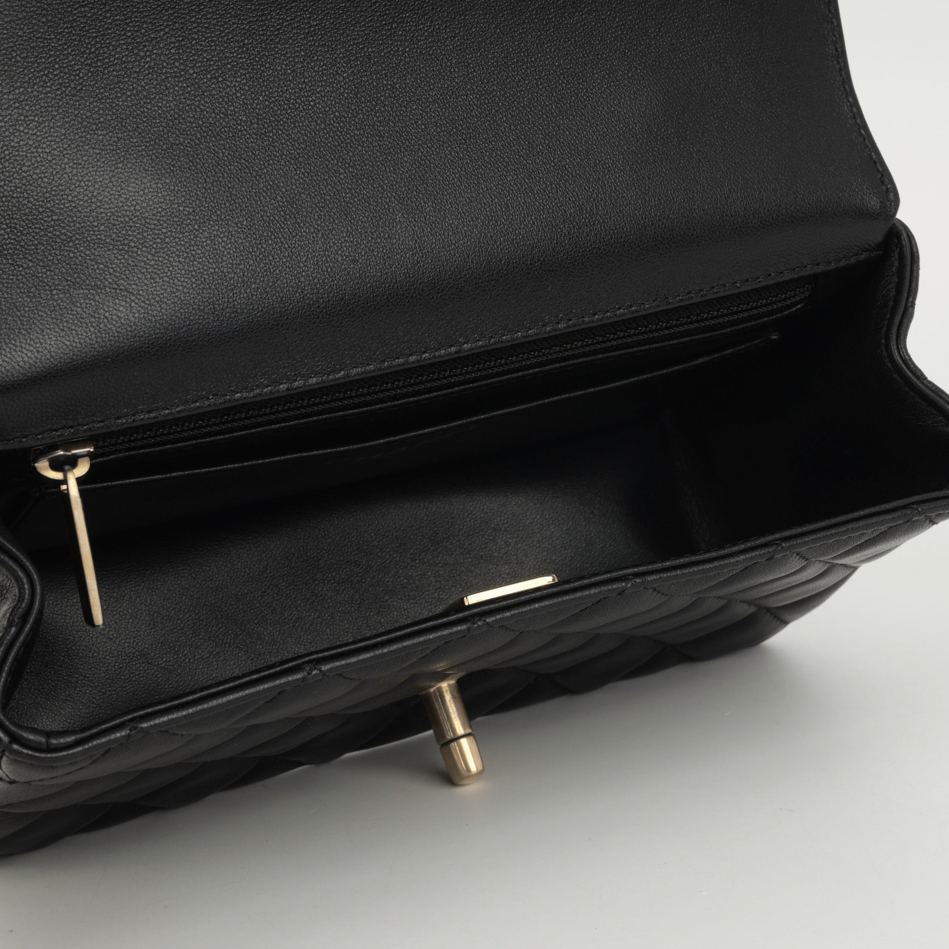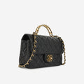 Its standout feature is the striking metal top handle, adorned with strass-encrusted “CHANEL” lettering and interwoven black leather. A detail that instantly elevates the piece with signature branding.