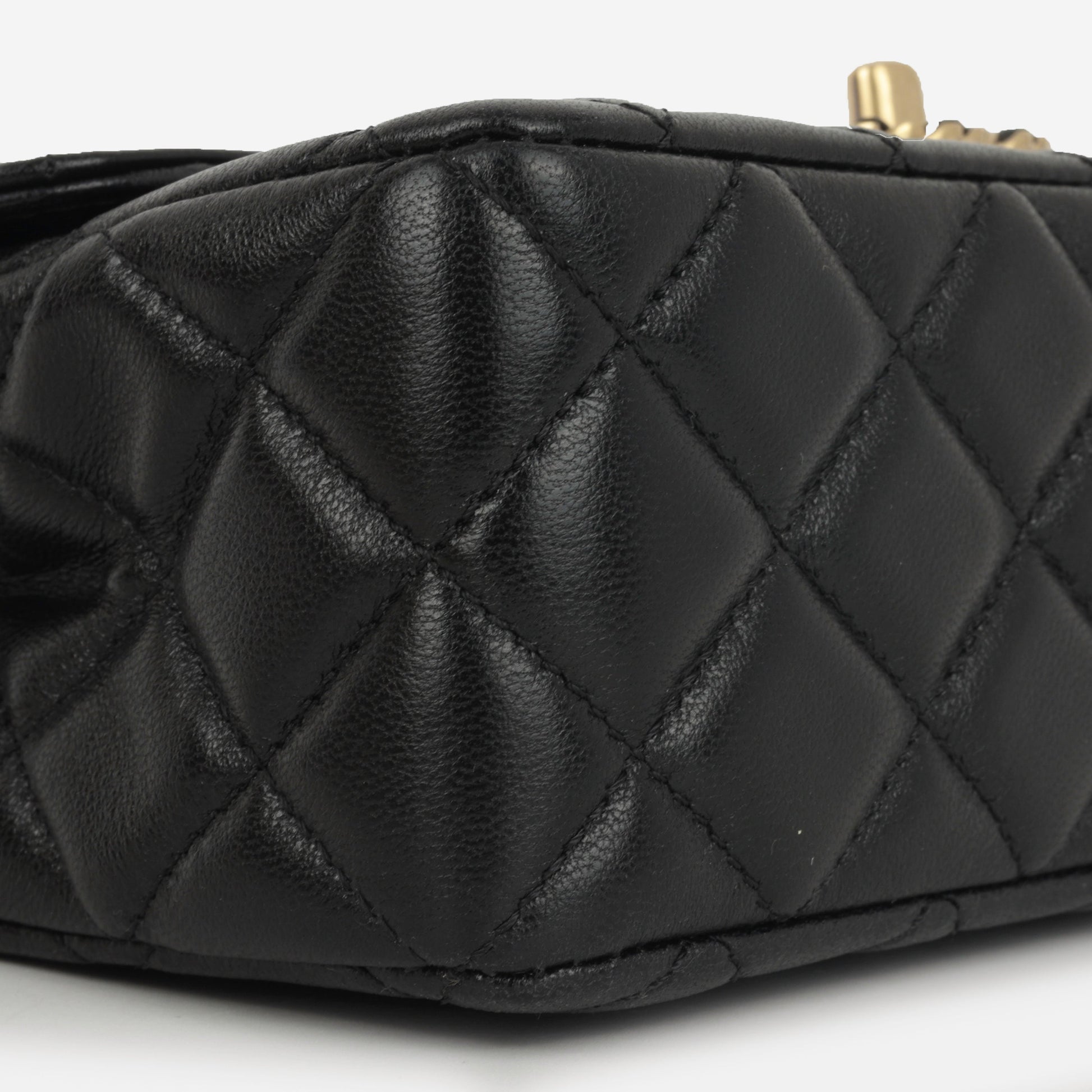 The Chanel Mini Rectangular Top Handle Flap Bag in black lambskin is a true fusion of classic Parisian elegance and bold modern luxury. Crafted from Chanel’s signature diamond-quilted lambskin leather, this structured mini silhouette is both timeless and fashion-forward.