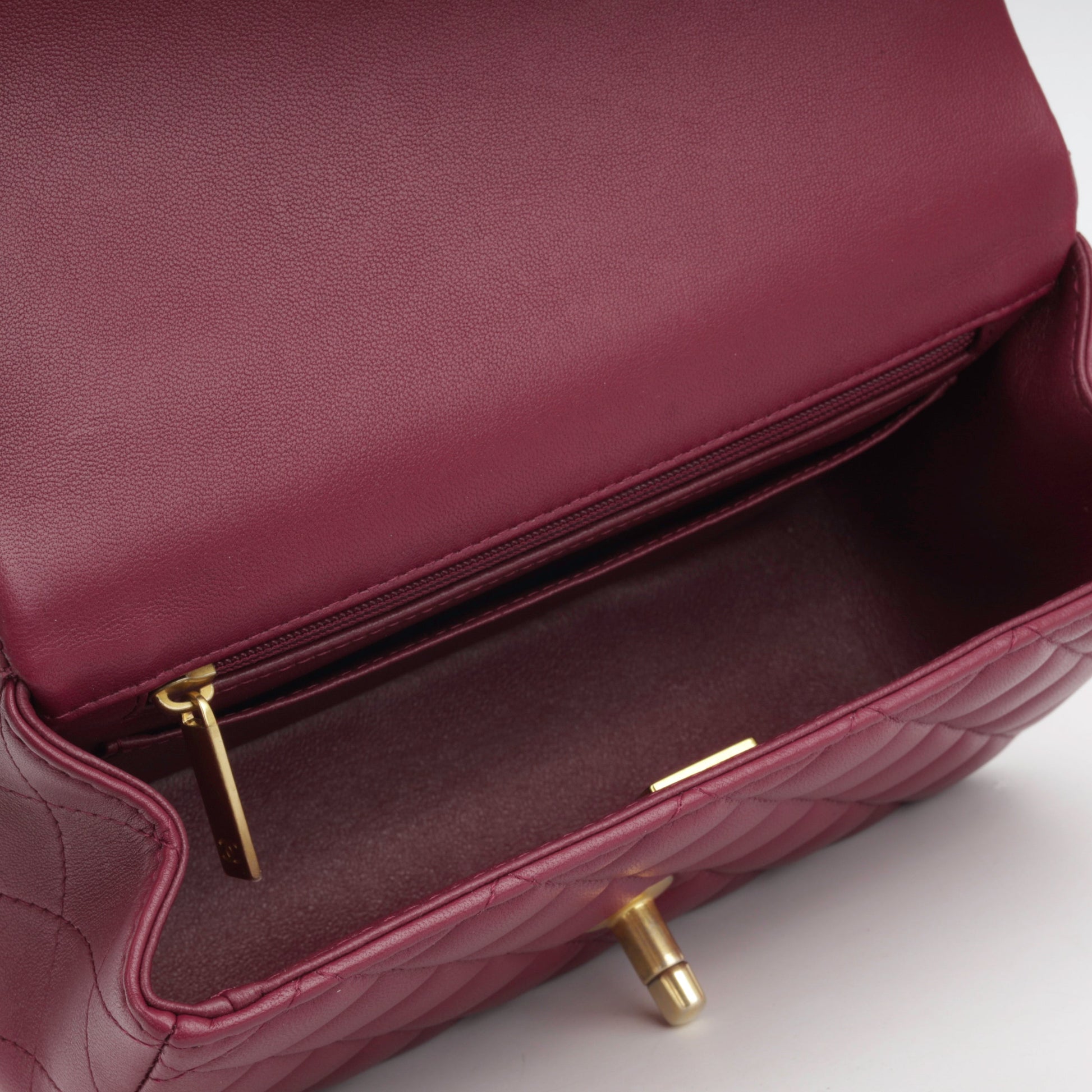 The mini rectangular Chanel flap bag comes with an updated feature of the top handle. Crafted from lambskin leather and coupled with champagne gold-tone hardware, this little Chanel is definitely hard to get your hands on.