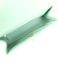 This Mini Rectangular flap bag is in light green lambskin with light gold tone hardware and has a front flap with signature CC turnlock closure, rear half moon pocket, top handle and single interwoven light green leather and light gold tone chain link shoulder/crossbody strap.