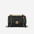 A row of luminous faux pearls forms a delicate top handle, adding a statement detail that transitions seamlessly from day to evening. The long chain strap interwoven with leather allows for crossbody or shoulder wear, while the signature CC turn-lock closure completes the look.