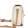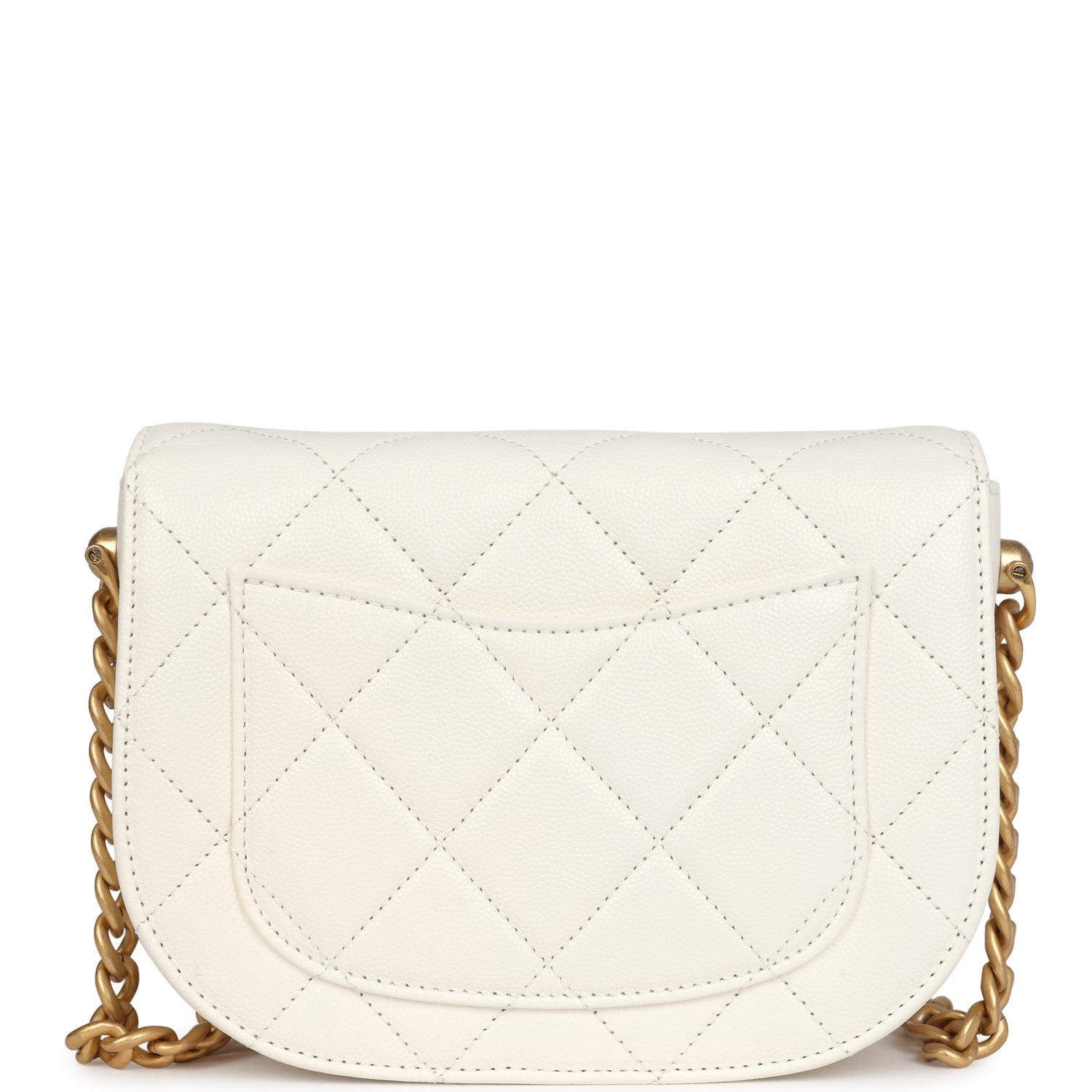 This Chanel mini Round Moon Messenger flap bag is in white caviar leather with antique gold hardware, featuring signature quilt, half moon back exterior pocket, front flap CC turnlock closure and a single antique gold tone chainlink and leather shoulder strap.