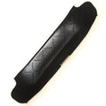The interior is lined in black quilted leather and has one front slit pocket, one main open compartment, and one small slit pocket on rear wall with logo.