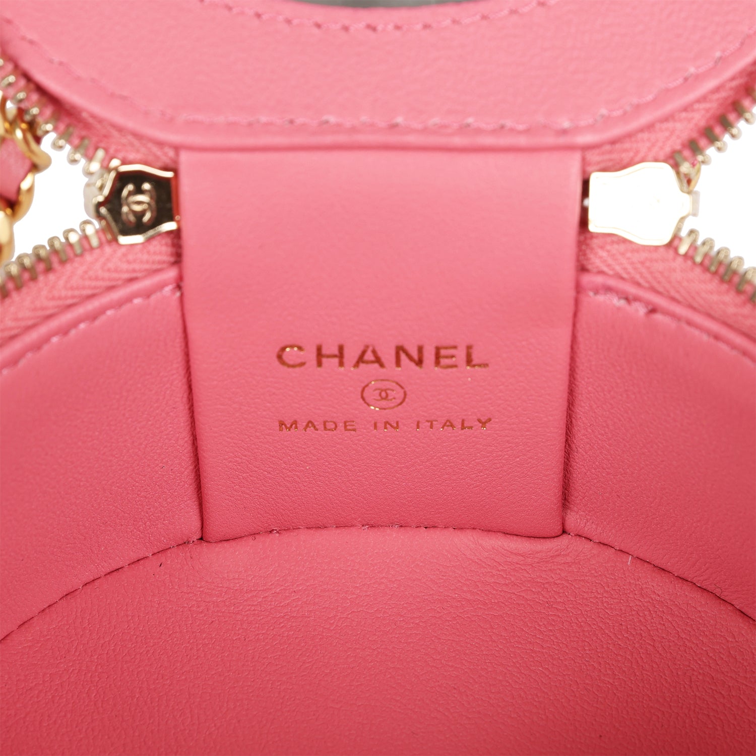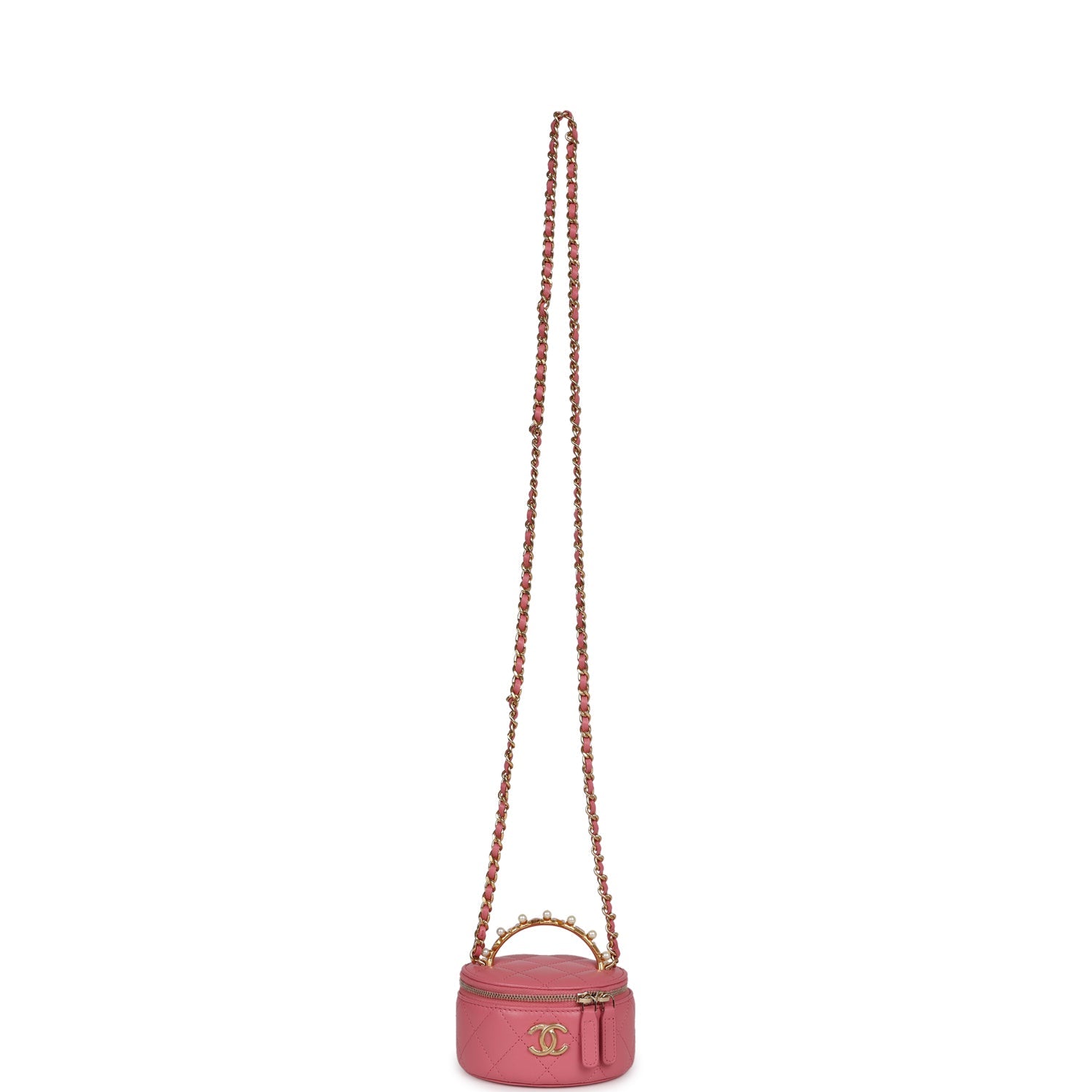 This Mini Round Top Handle Vanity Case is in Dark Pink Quilted Lambskin leather with Gold Hardware, features a round case design, a gold "CHANEL" logo top handle with pink enamel writing and Pearl studs in-between the letters, an oval shape built-in mirror in the flap, one small gathered slip pocket, zip around closure with leather pull tabs, a gold CC logo on front of bag, gold interwoven with pink leather shoulder/crossbody strap and CC stitched into the leather on bottom of vanity bag.