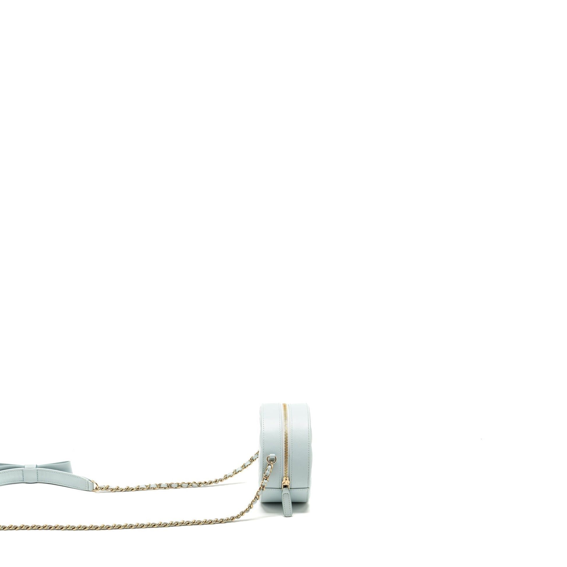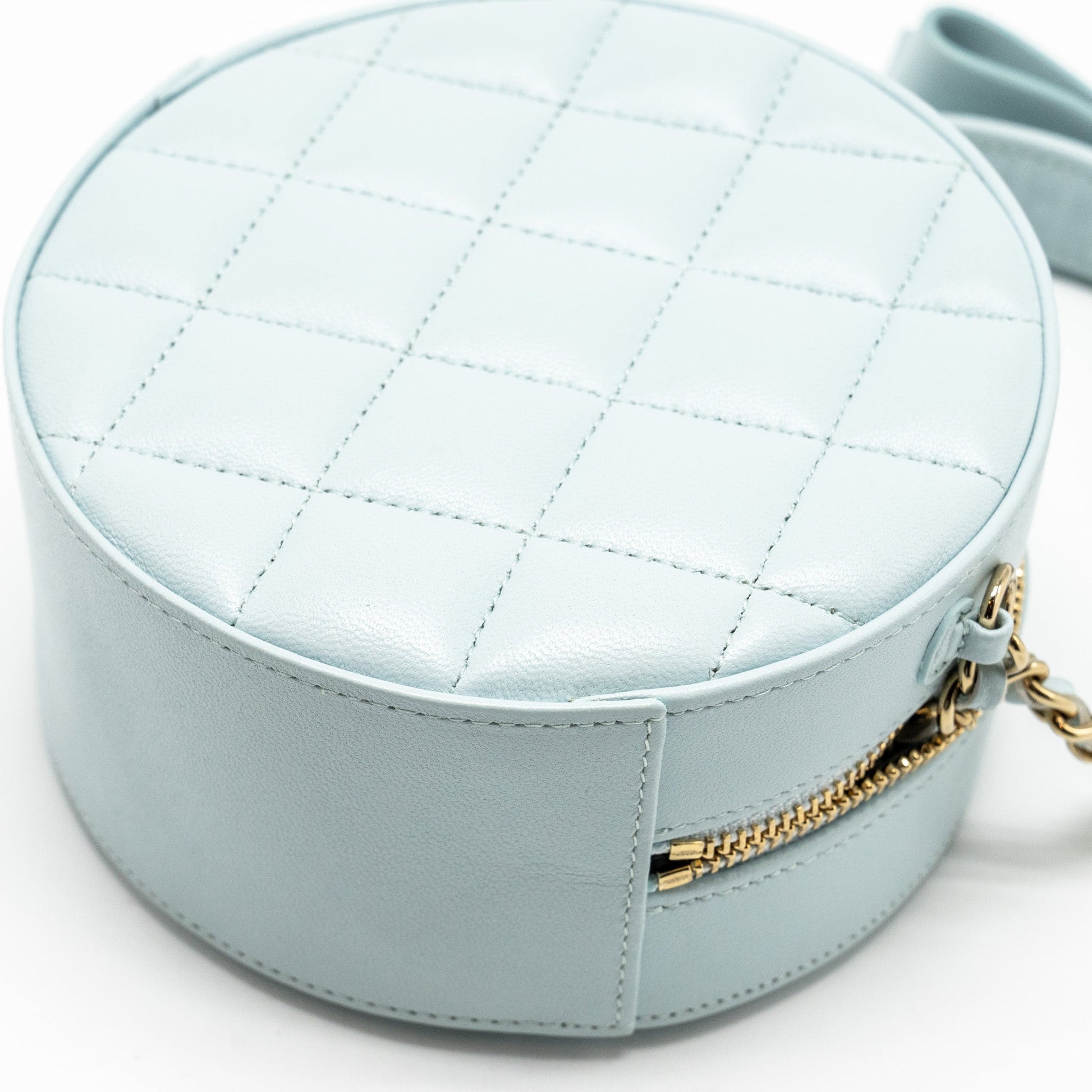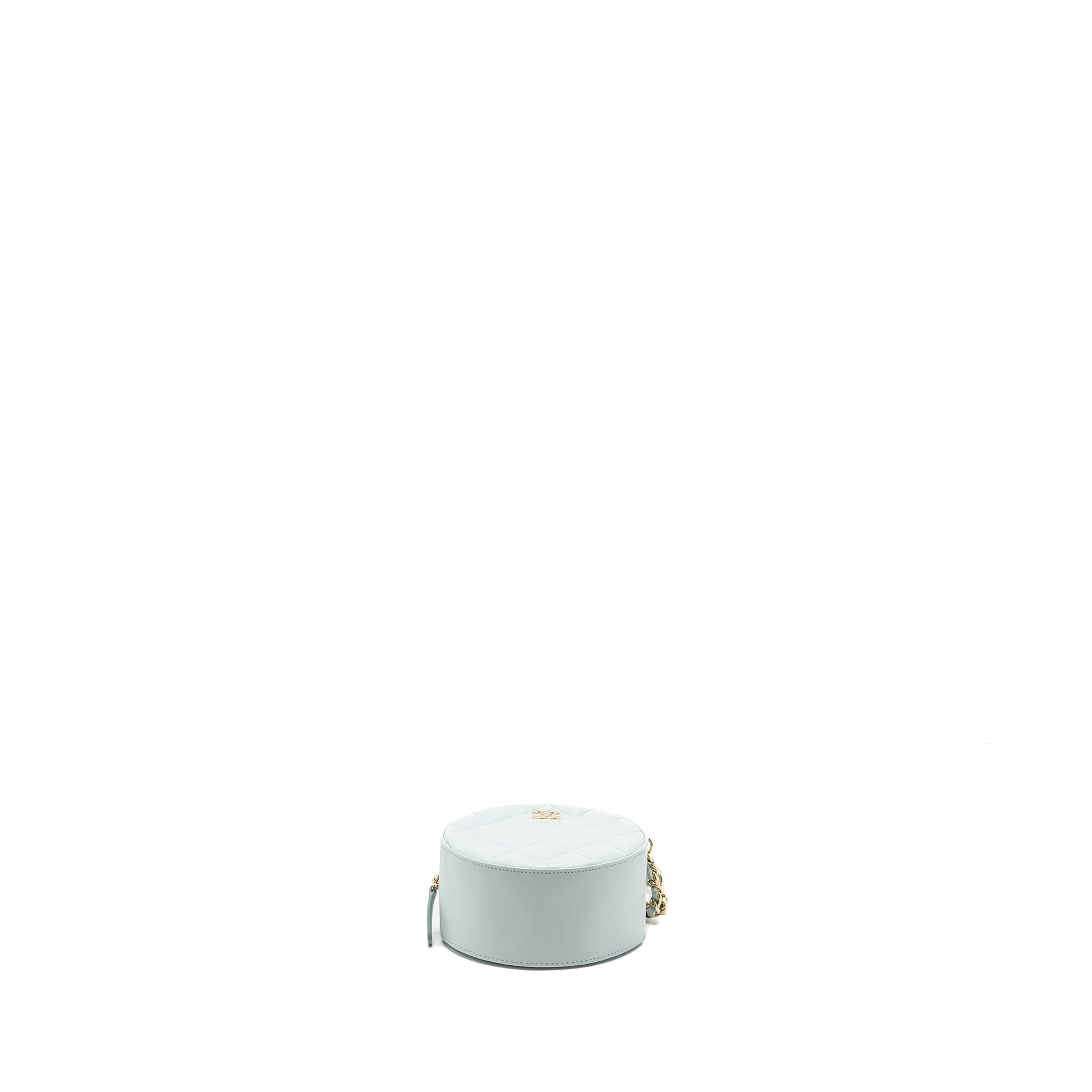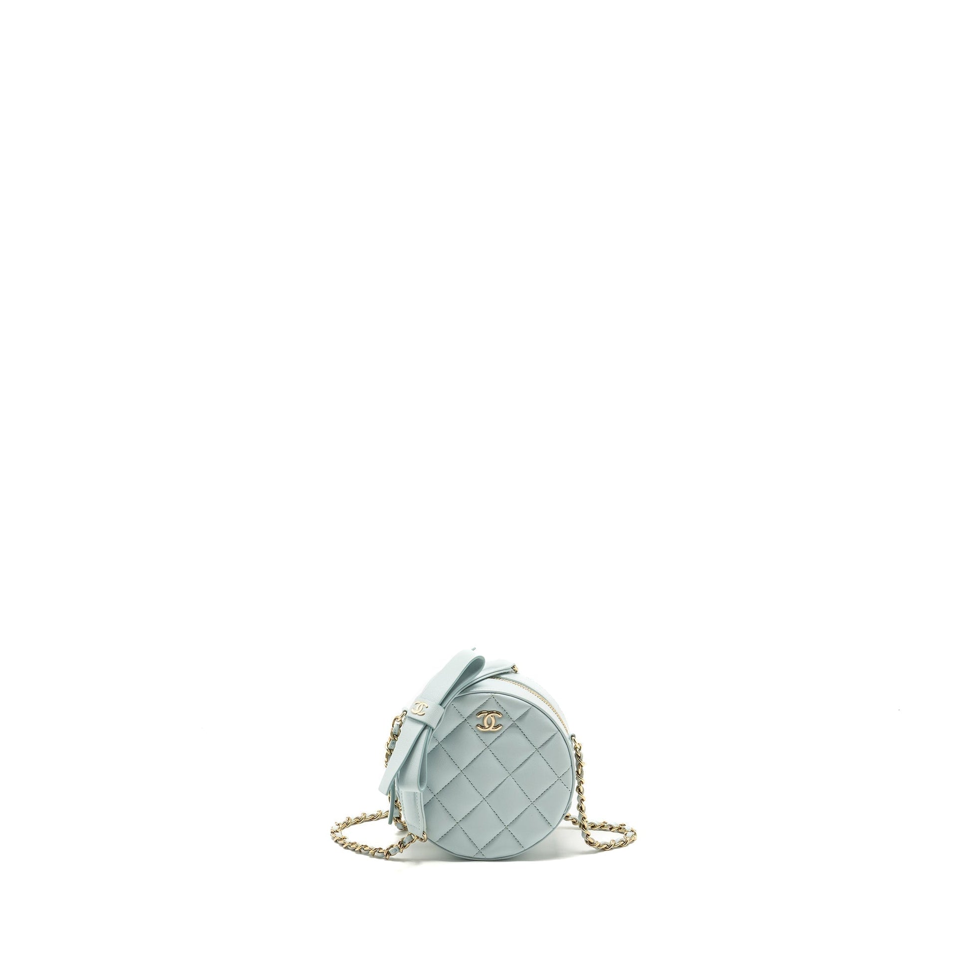 Chanel Mini Round Vanity With ribbon on chain Lambskin Light Blue LGHW