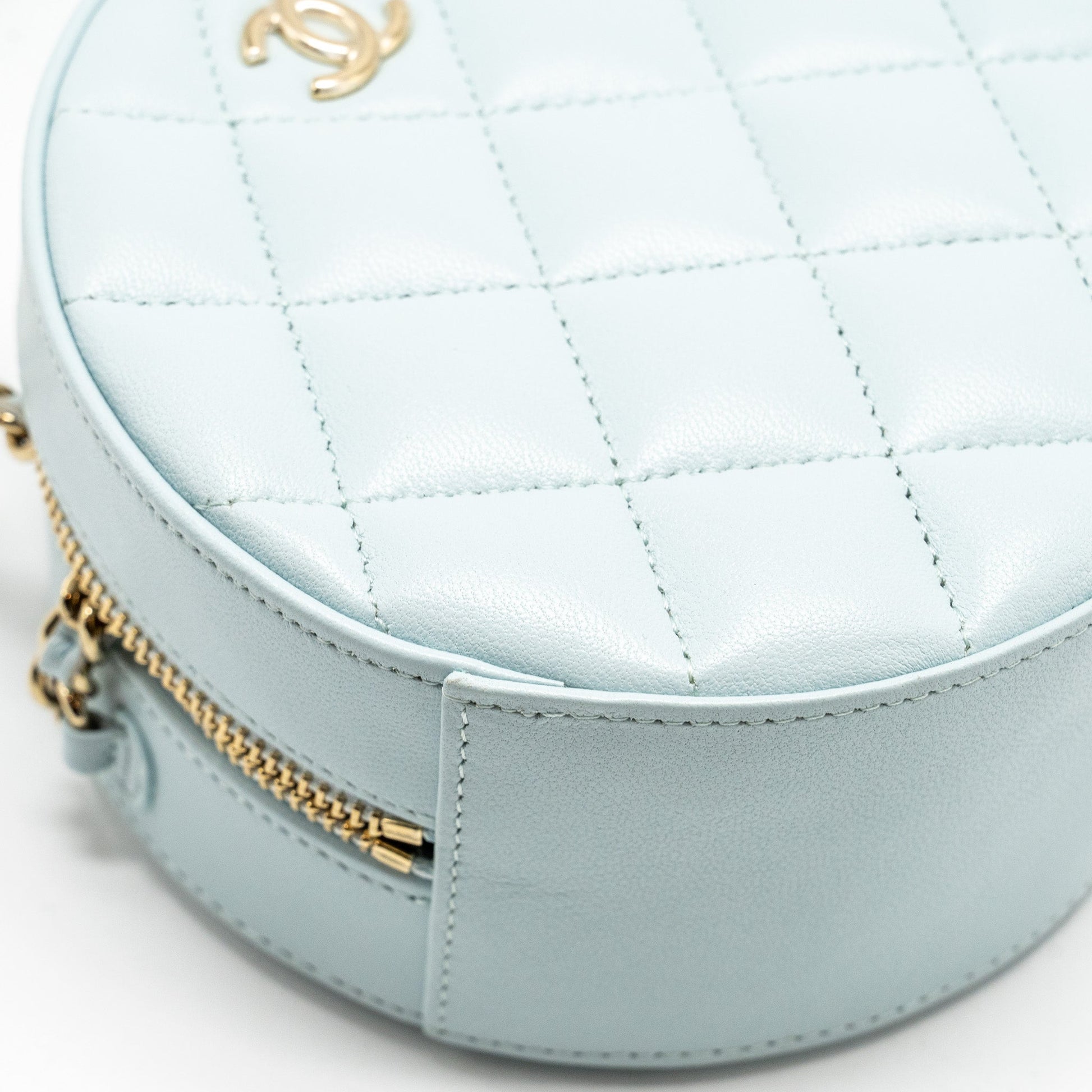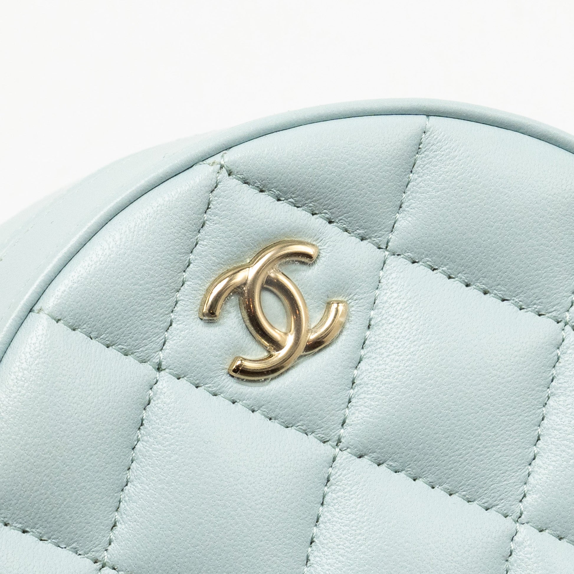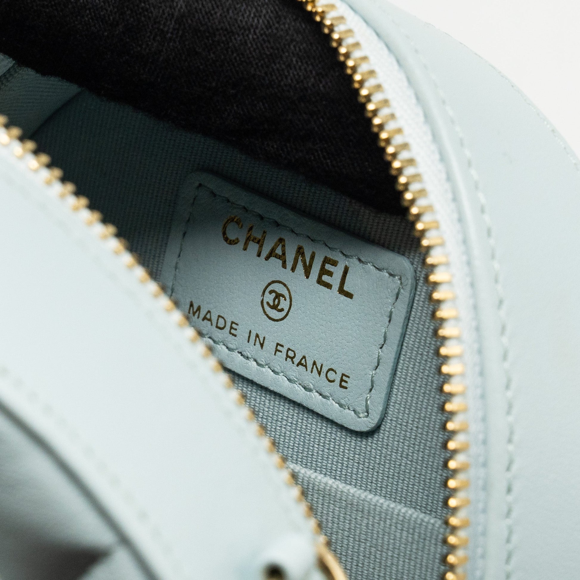 Chanel Mini Round Vanity With ribbon on chain Lambskin Light Blue LGHW