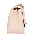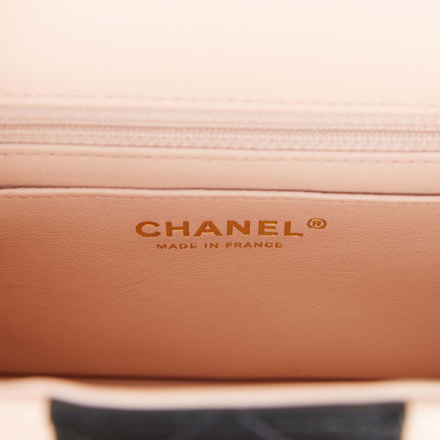 The interior is lined in pink leather and features a zipper pocket with Chanel pull and an open pocket below.