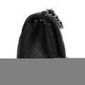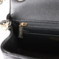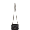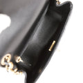 This Mini Square flap bag is in black lambskin with light gold tone hardware and has a front flap with signature CC turnlock closure, rear half moon pocket and single interwoven black leather and light gold tone chain link shoulder/crossbody strap.